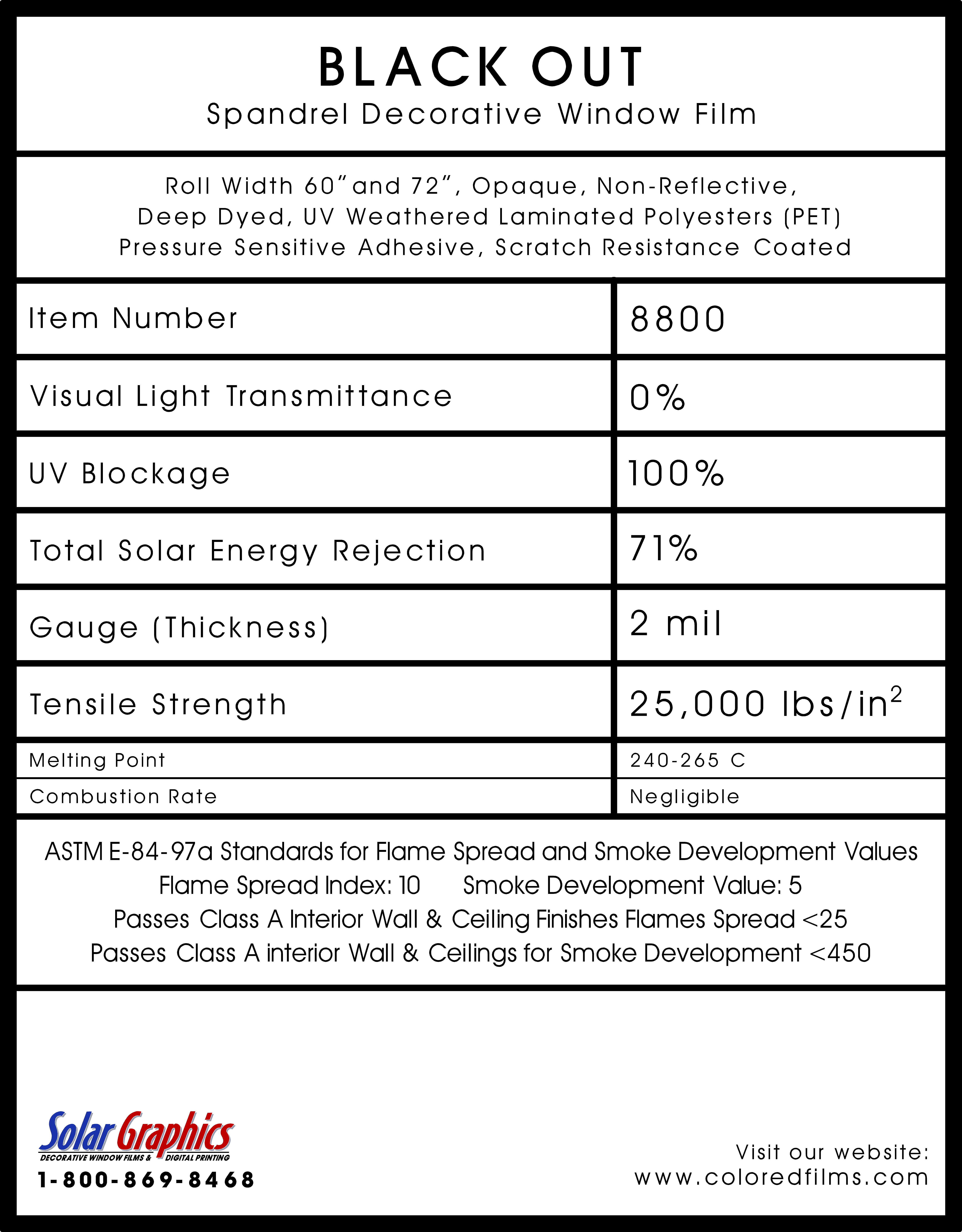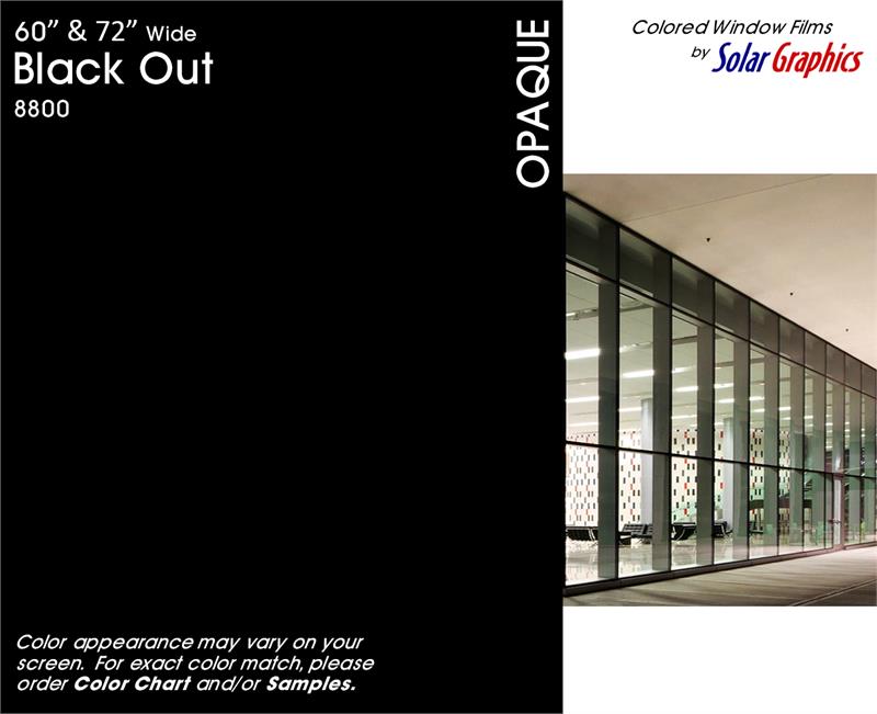 Black Out .... Visual Light Transmittance 0% | Total Solar Energy Rejection 71% --------------------------------------------------------------------------- Opaque | Non-Reflective | UV Weathered Deep Dyed Polyester | Pressure Sensitive | Scratch Coated