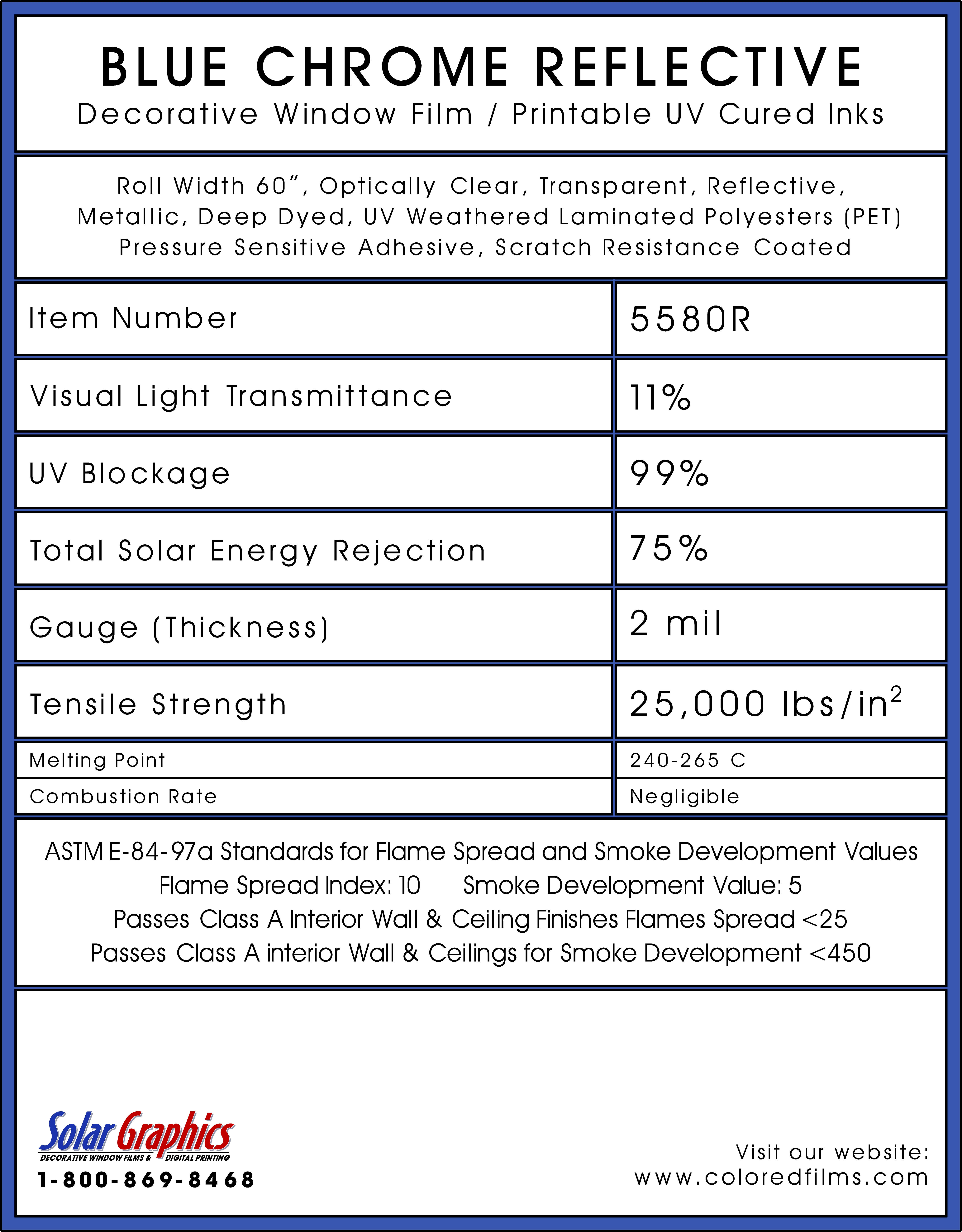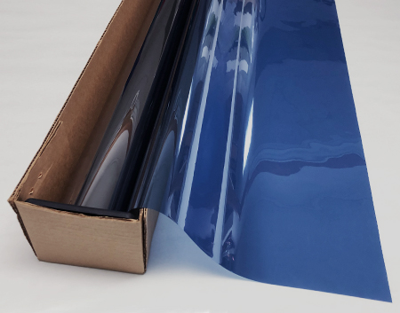 Blue Chrome Reflective .... Visual Light Transmittance 11% | Total Solar Energy Rejection 75% --------------------------------------------------------------------------- Transparent | Reflective | UV Weathered Deep Dyed Polyester | Pressure Sensitive | Scratch Coated