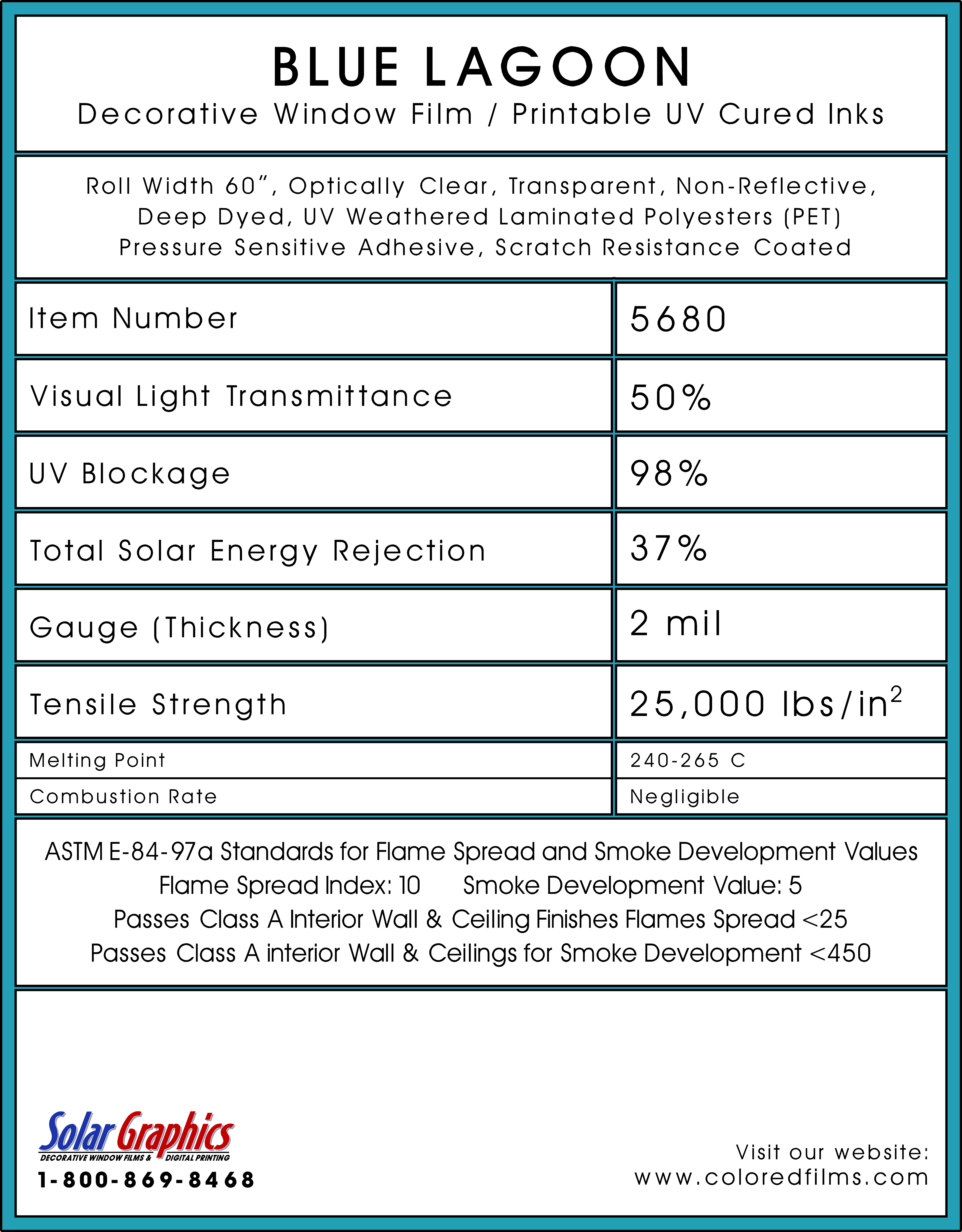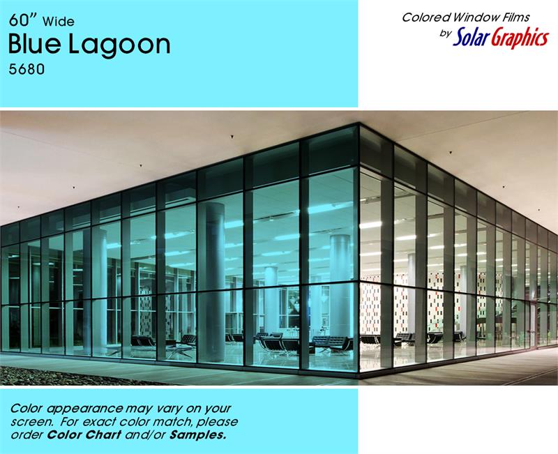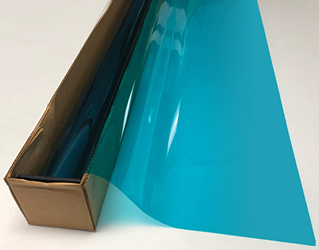 Blue Lagoon .... Visual Light Transmittance 50% | Total Solar Energy Rejection 37% --------------------------------------------------------------------------- Transparent | Non-Reflective | UV Weathered Deep Dyed Polyester | Pressure Sensitive | Scratch Coated