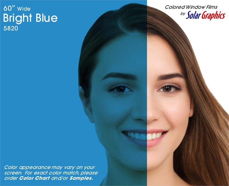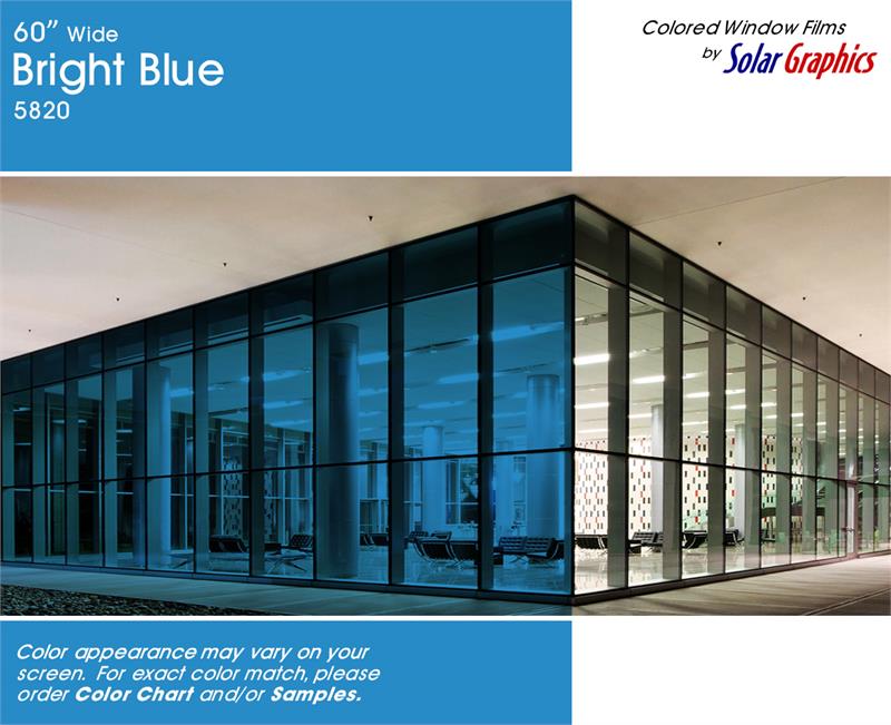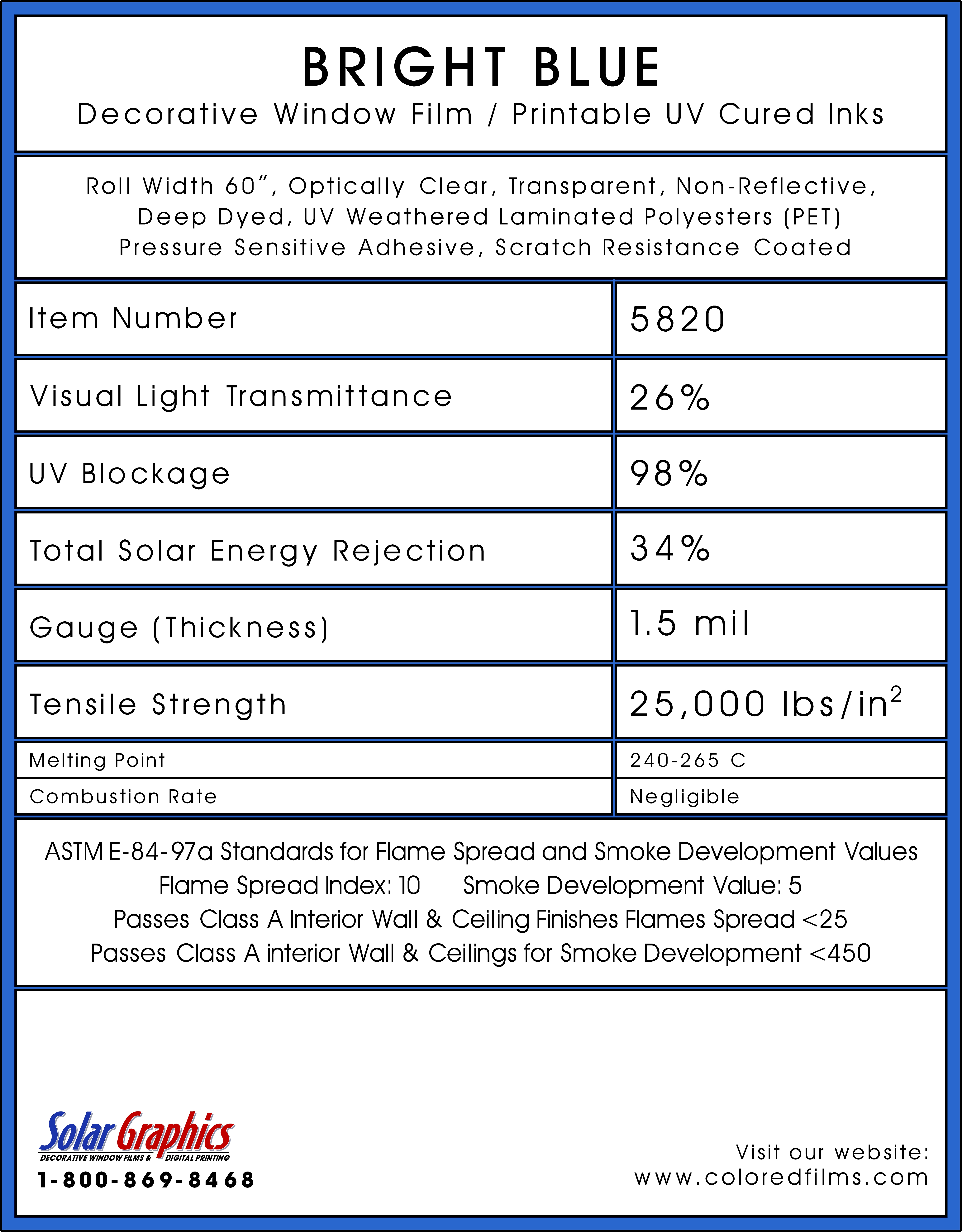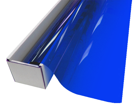 Bright Blue .... Visual Light Transmittance 26% | Total Solar Energy Rejection 34% --------------------------------------------------------------------------- Transparent | Non-Reflective | UV Weathered Deep Dyed Polyester | Pressure Sensitive | Scratch Coated