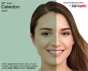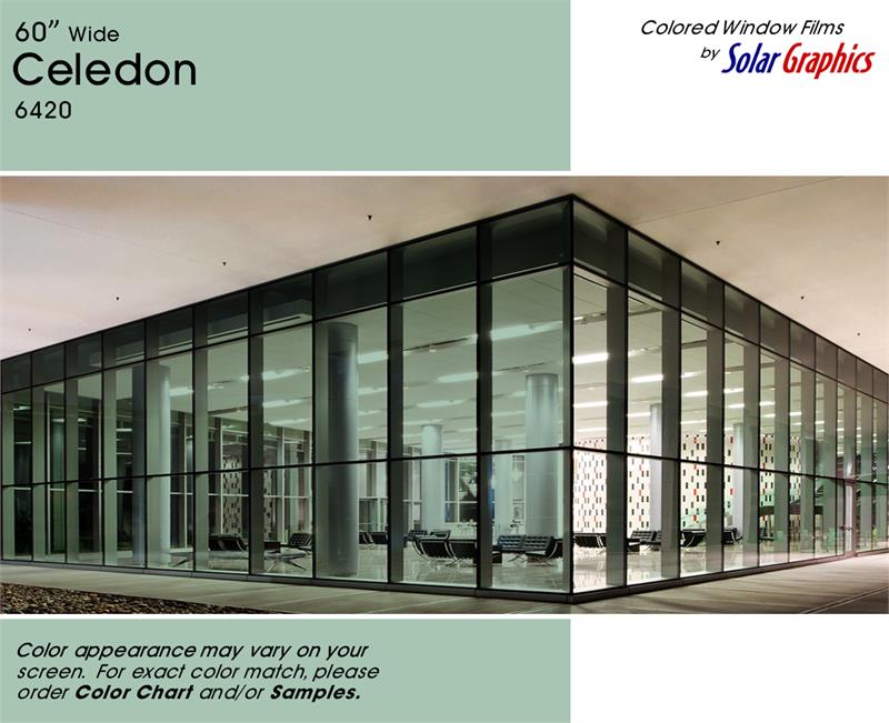 Celedon .... Visual Light Transmittance 50% | Total Solar Energy Rejection 33% --------------------------------------------------------------------------- Transparent | Non-Reflective | UV Weathered Deep Dyed Polyester | Pressure Sensitive | Scratch Coated