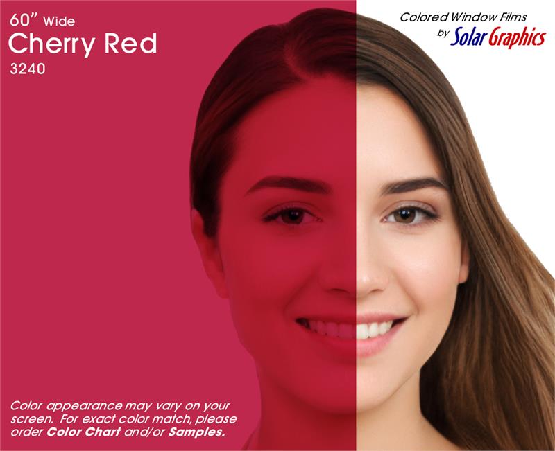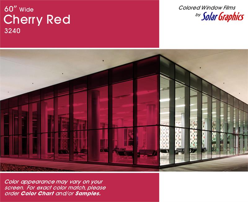 Cherry Red .... Visual Light Transmittance 24% | Total Solar Energy Rejection 37% --------------------------------------------------------------------------- Transparent | Non-Reflective | UV Weathered Deep Dyed Polyester | Pressure Sensitive | Scratch Coated