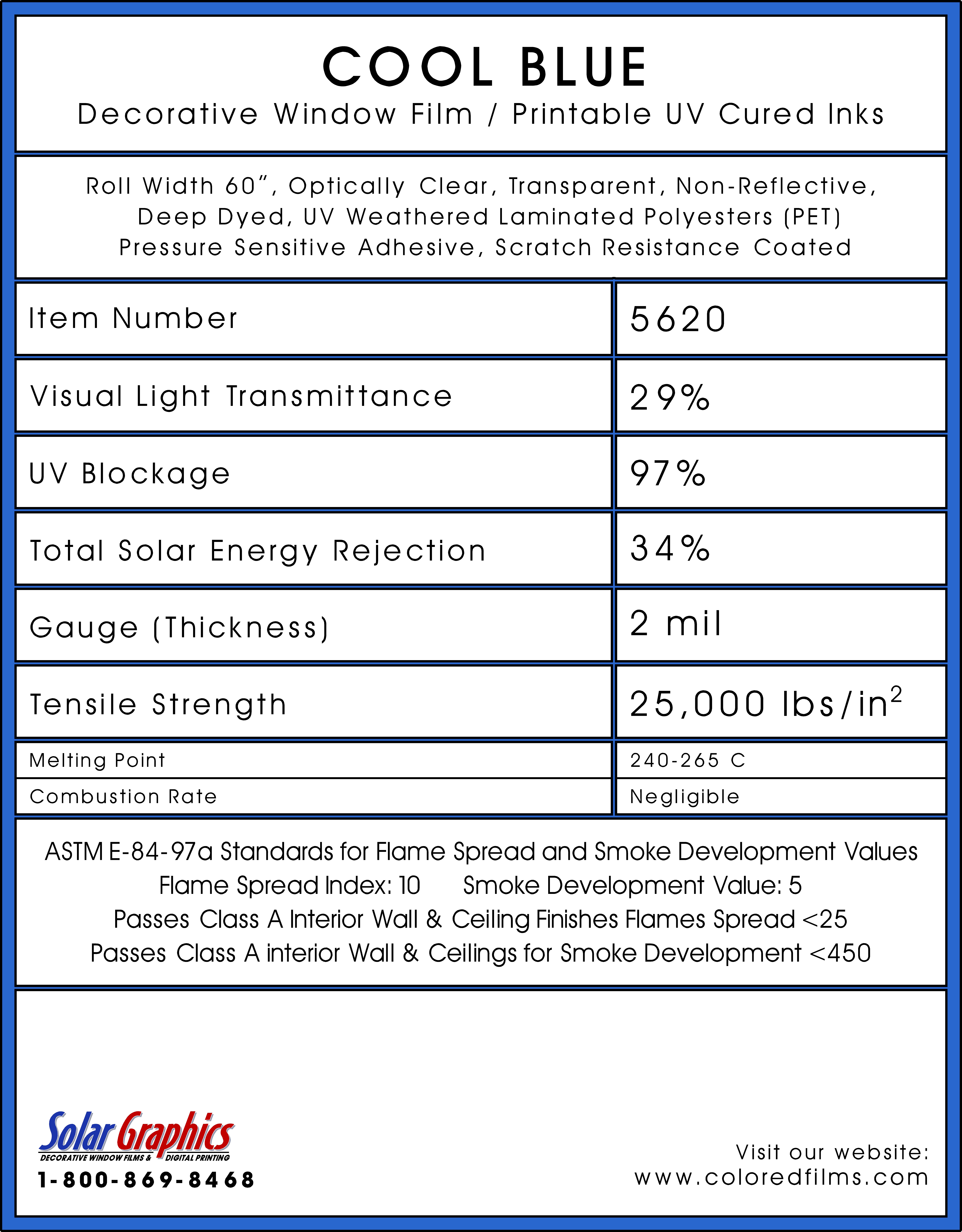 Cool Blue .... Visual Light Transmittance 29% | Total Solar Energy Rejection 34% --------------------------------------------------------------------------- Transparent | Non-Reflective | UV Weathered Deep Dyed Polyester | Pressure Sensitive | Scratch Coated