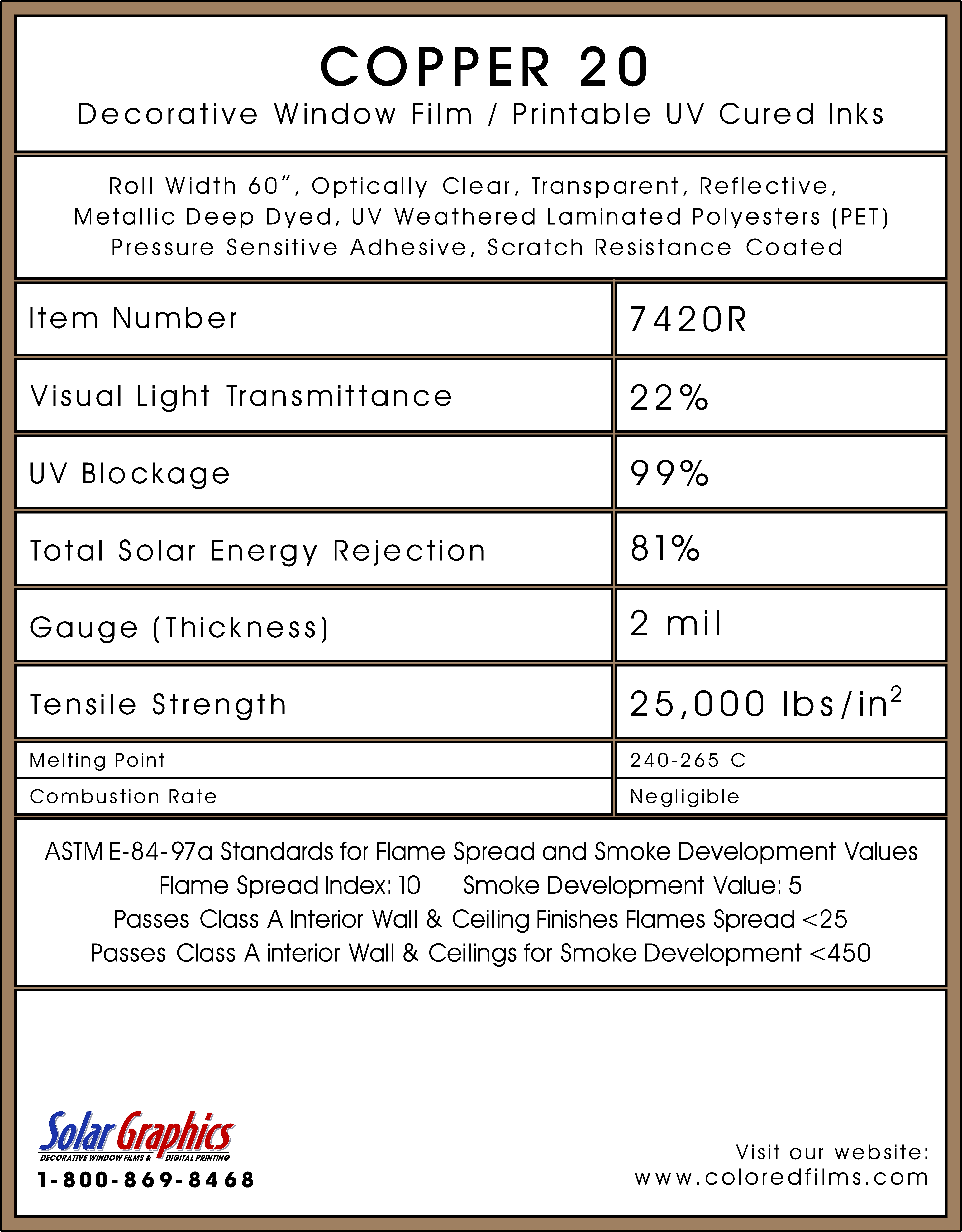 Copper 20 .... Visual Light Transmittance 22% | Total Solar Energy Rejection 81% --------------------------------------------------------------------------- Transparent | Reflective | UV Weathered Deep Dyed Polyester | Pressure Sensitive | Scratch Coated