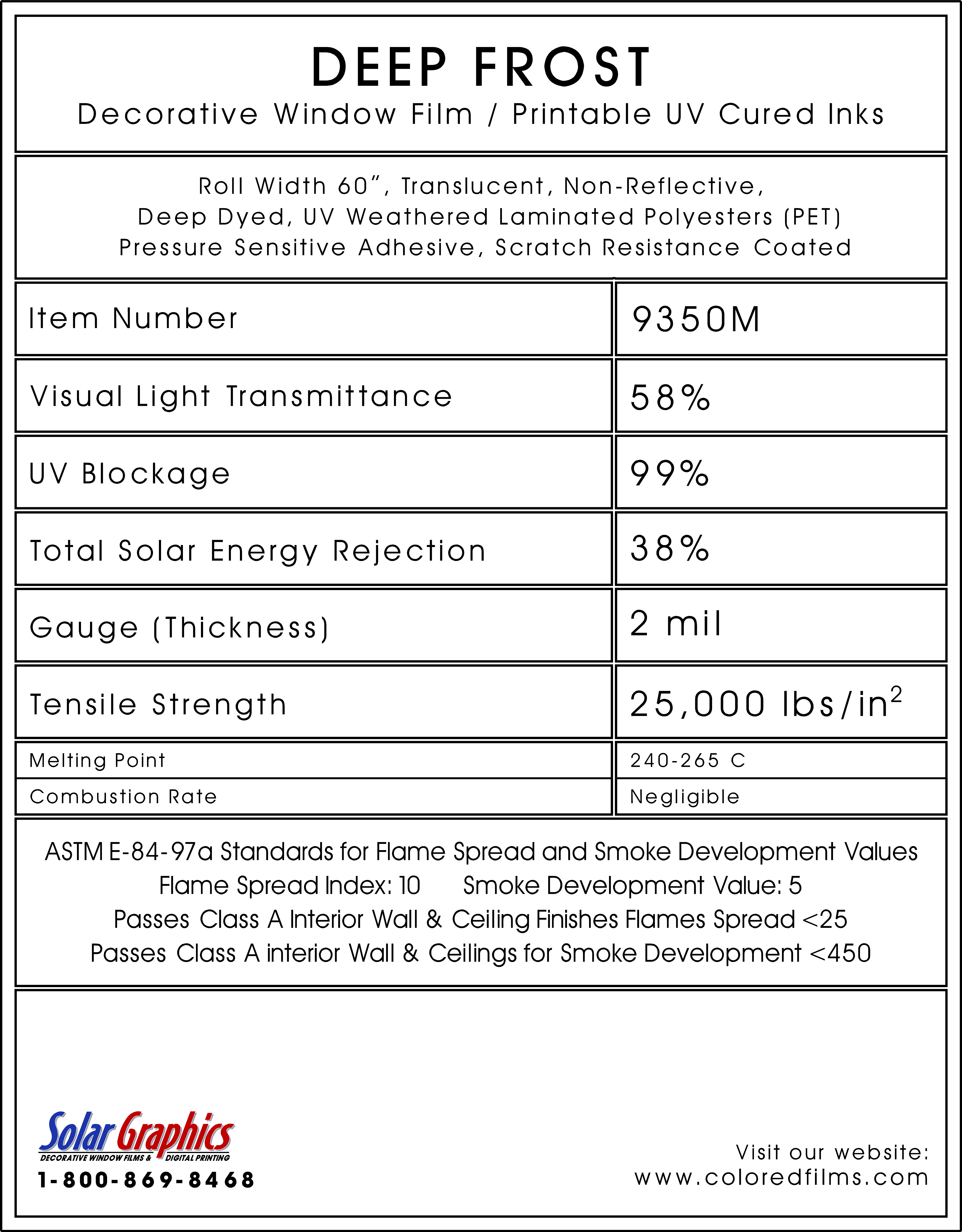 Deep Frost .... Visual Light Transmittance 42% | Total Solar Energy Rejection 40% --------------------------------------------------------------------------- Translucent | Non-Reflective | UV Weathered Deep Dyed Polyester | Pressure Sensitive | Scratch Coated