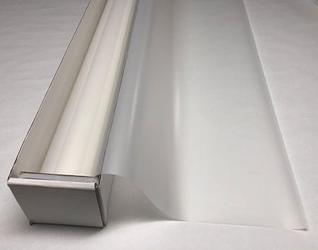 Etch Frost .... Visual Light Transmittance 65% | Total Solar Energy Rejection 24% --------------------------------------------------------------------------- Translucent | Non-Reflective | UV Weathered Deep Dyed Polyester | Pressure Sensitive | Scratch Coated
