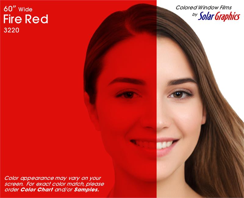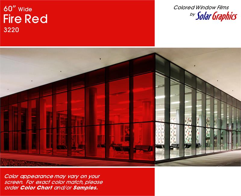 Fire Red .... Visual Light Transmittance 34% | Total Solar Energy Rejection 37% --------------------------------------------------------------------------- Transparent | Non-Reflective | UV Weathered Deep Dyed Polyester | Pressure Sensitive | Scratch Coated