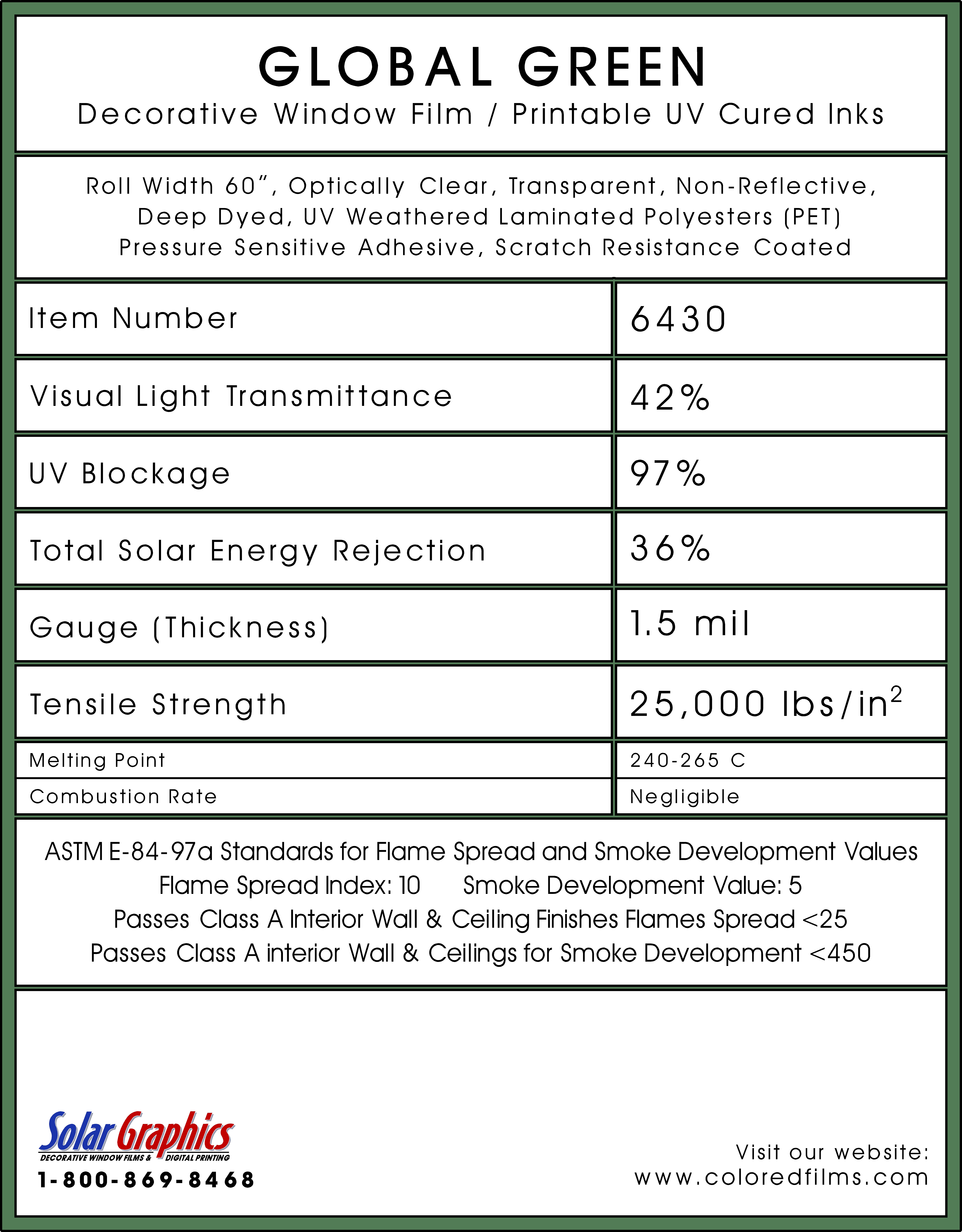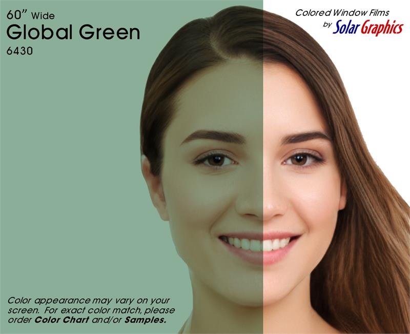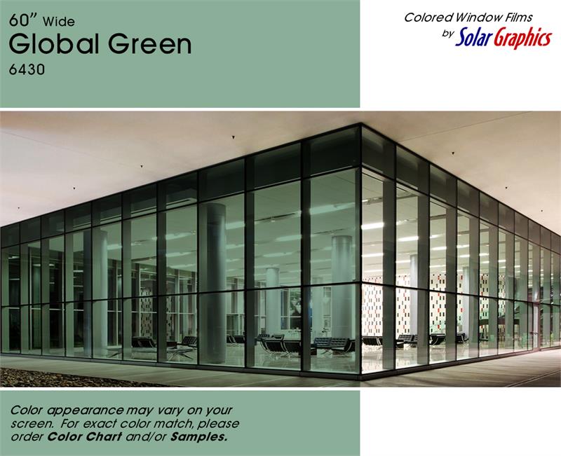 Global Green .... Visual Light Transmittance 42% | Total Solar Energy Rejection 36% --------------------------------------------------------------------------- Transparent | Non-Reflective | UV Weathered Deep Dyed Polyester | Pressure Sensitive | Scratch Coated
