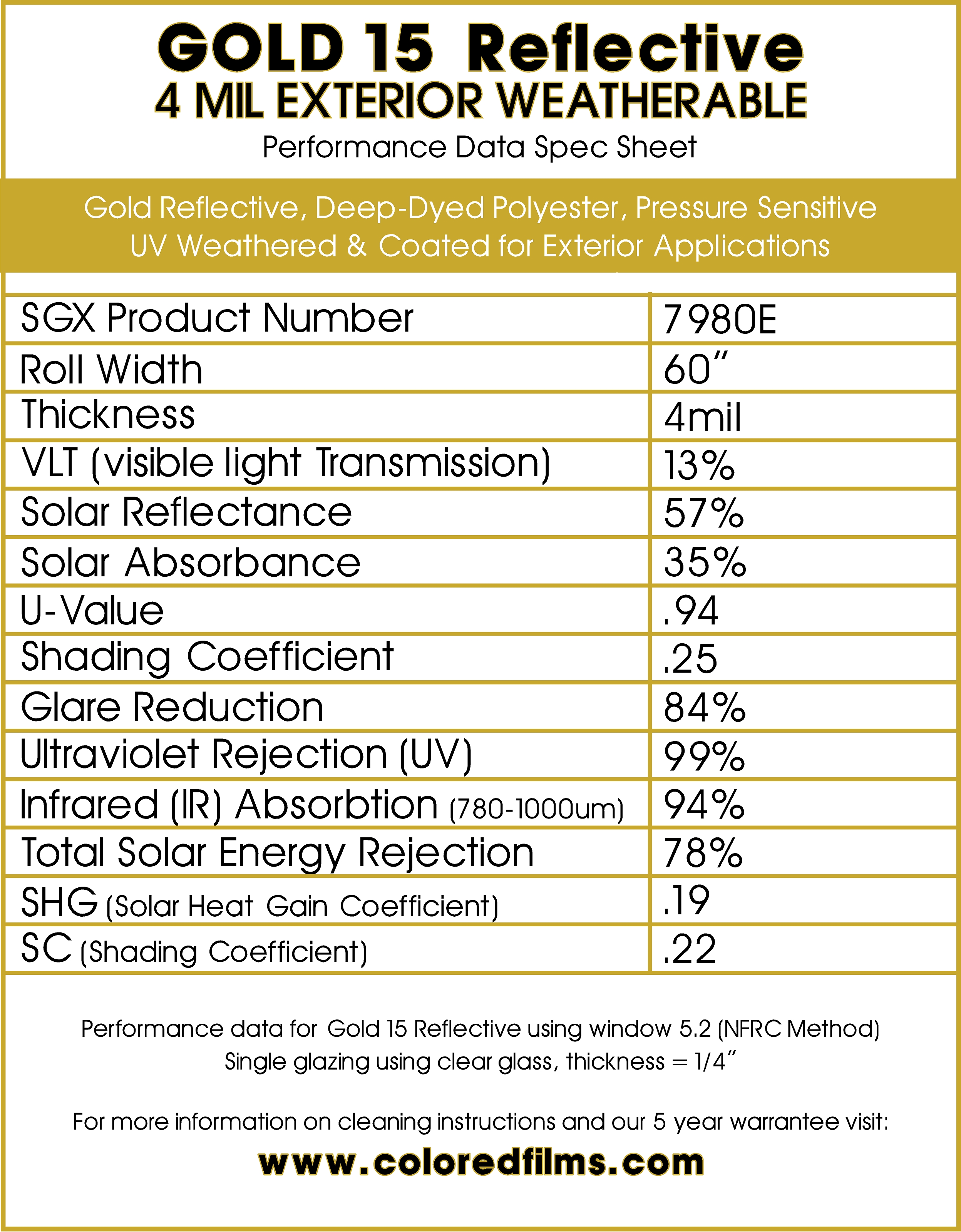 Gold 15 Reflective .... 4 Mil Exterior Weatherable Visual Light Transmittance 13% | Total Solar Energy Rejection 78% --------------------------------------------------------------------------- Transparent | Reflective | UV Weathered Deep Dyed Polyester | Pressure Sensitive | Scratch Coated
