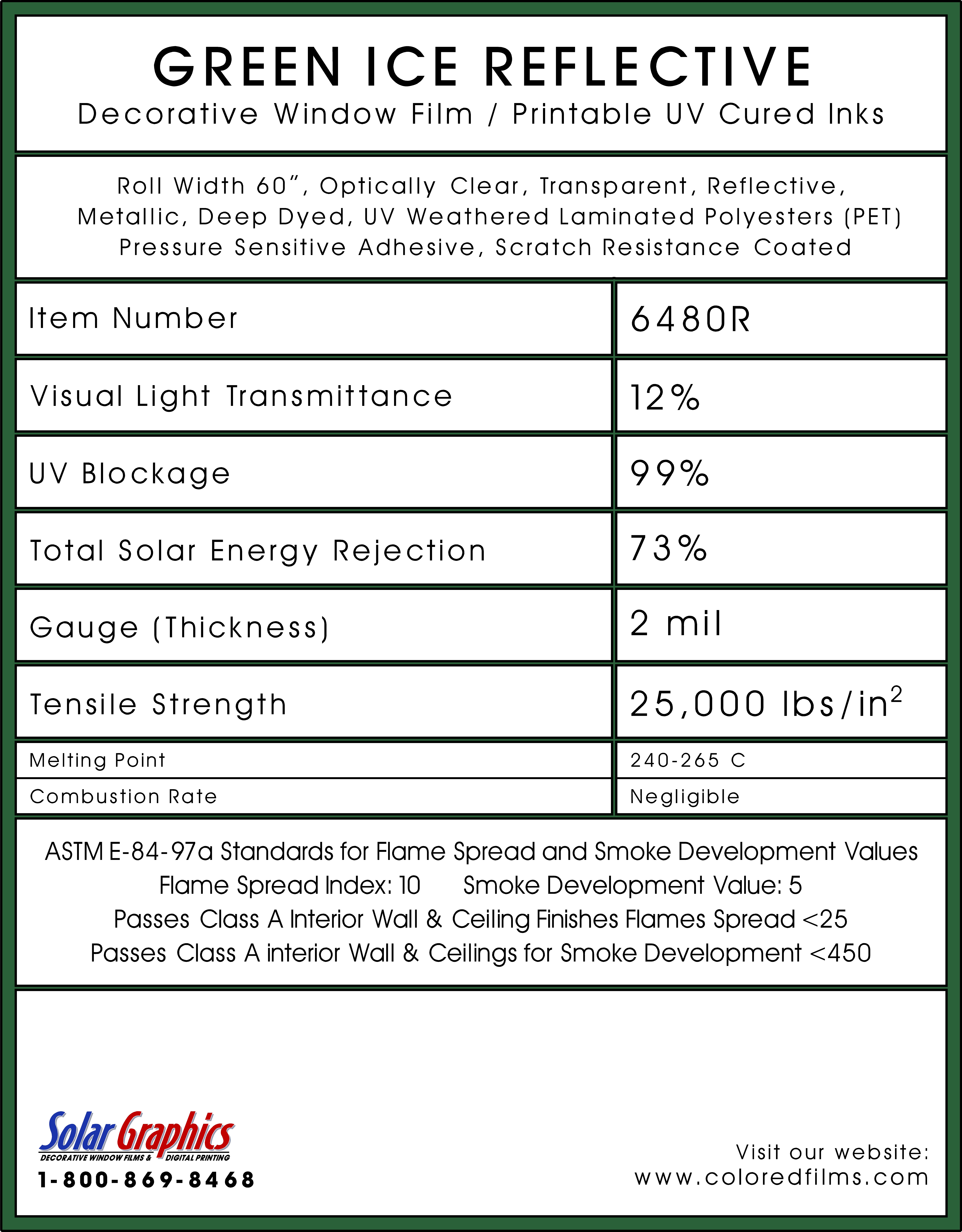 Green Ice Reflective .... Visual Light Transmittance 12% | Total Solar Energy Rejection 73% --------------------------------------------------------------------------- Transparent | Reflective | UV Weathered Deep Dyed Polyester | Pressure Sensitive | Scratch Coated