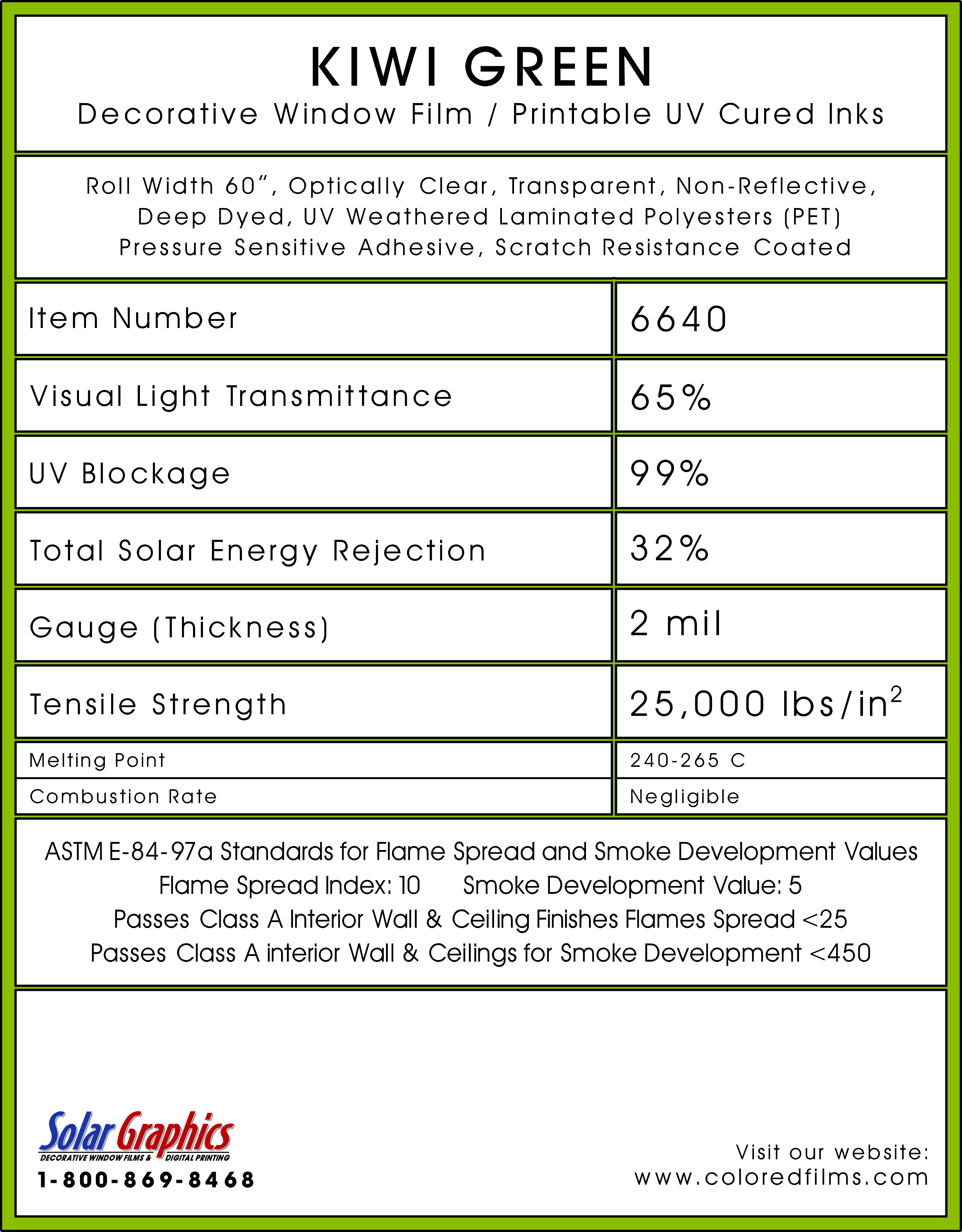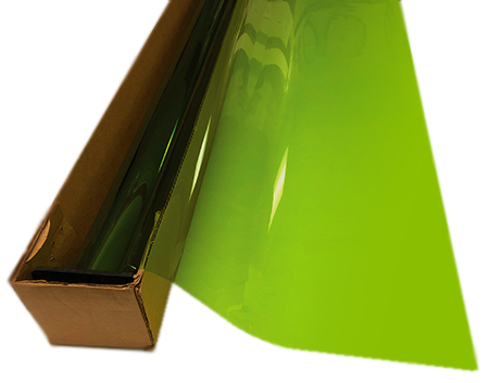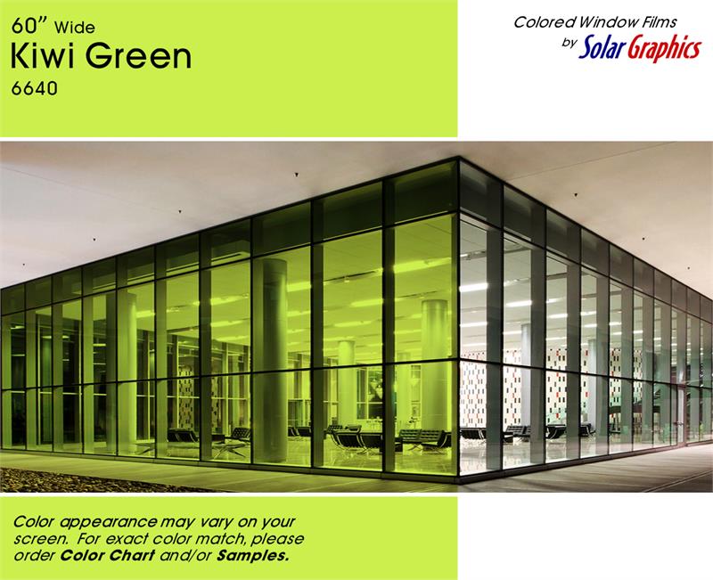Kiwi Green .... Visual Light Transmittance 65% | Total Solar Energy Rejection 32% --------------------------------------------------------------------------- Transparent | Non-Reflective | UV Weathered Deep Dyed Polyester | Pressure Sensitive | Scratch Coated