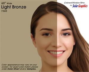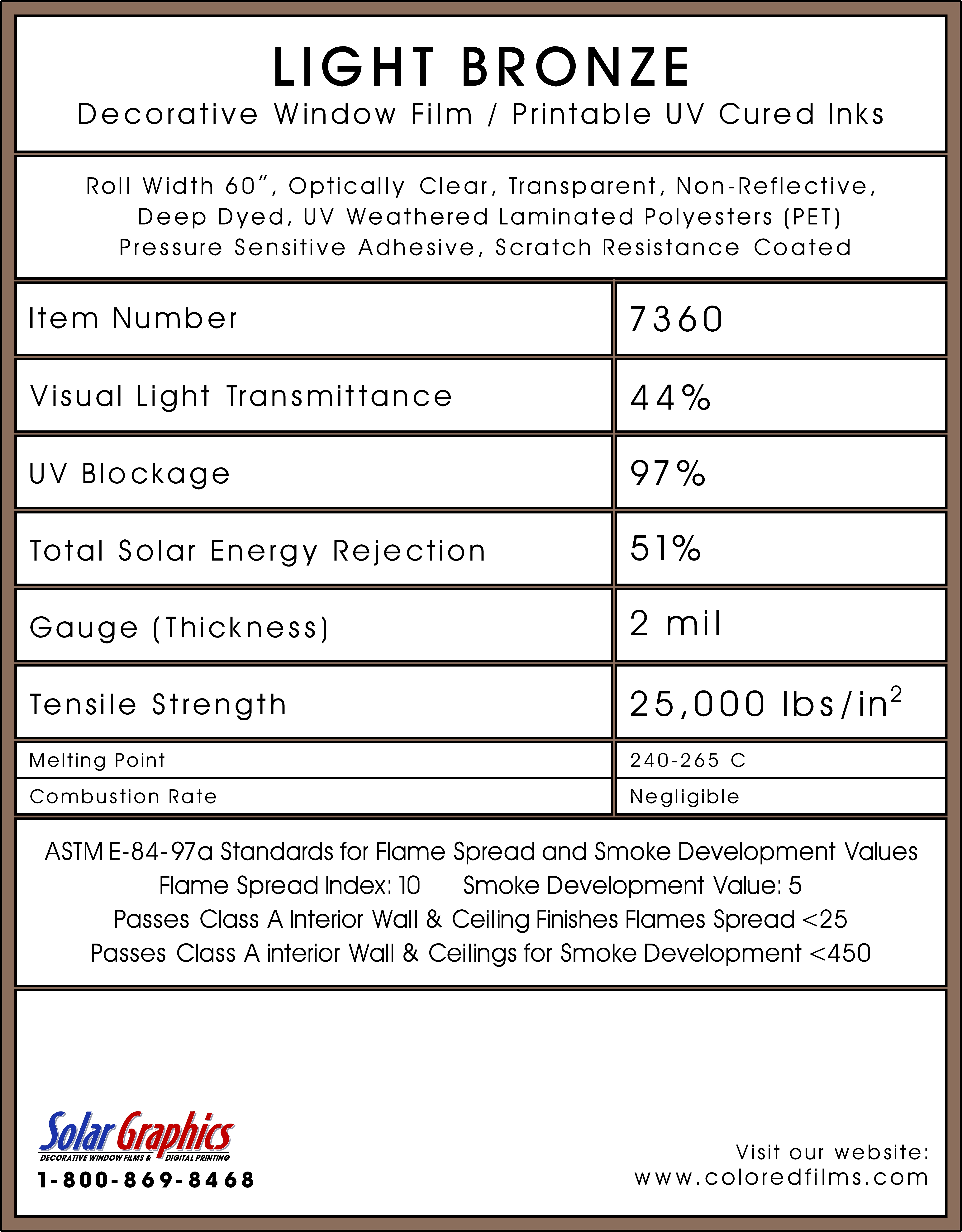 Light Bronze .... Visual Light Transmittance 44% | Total Solar Energy Rejection 51% --------------------------------------------------------------------------- Transparent | Non-Reflective | UV Weathered Deep Dyed Polyester | Pressure Sensitive | Scratch Coated