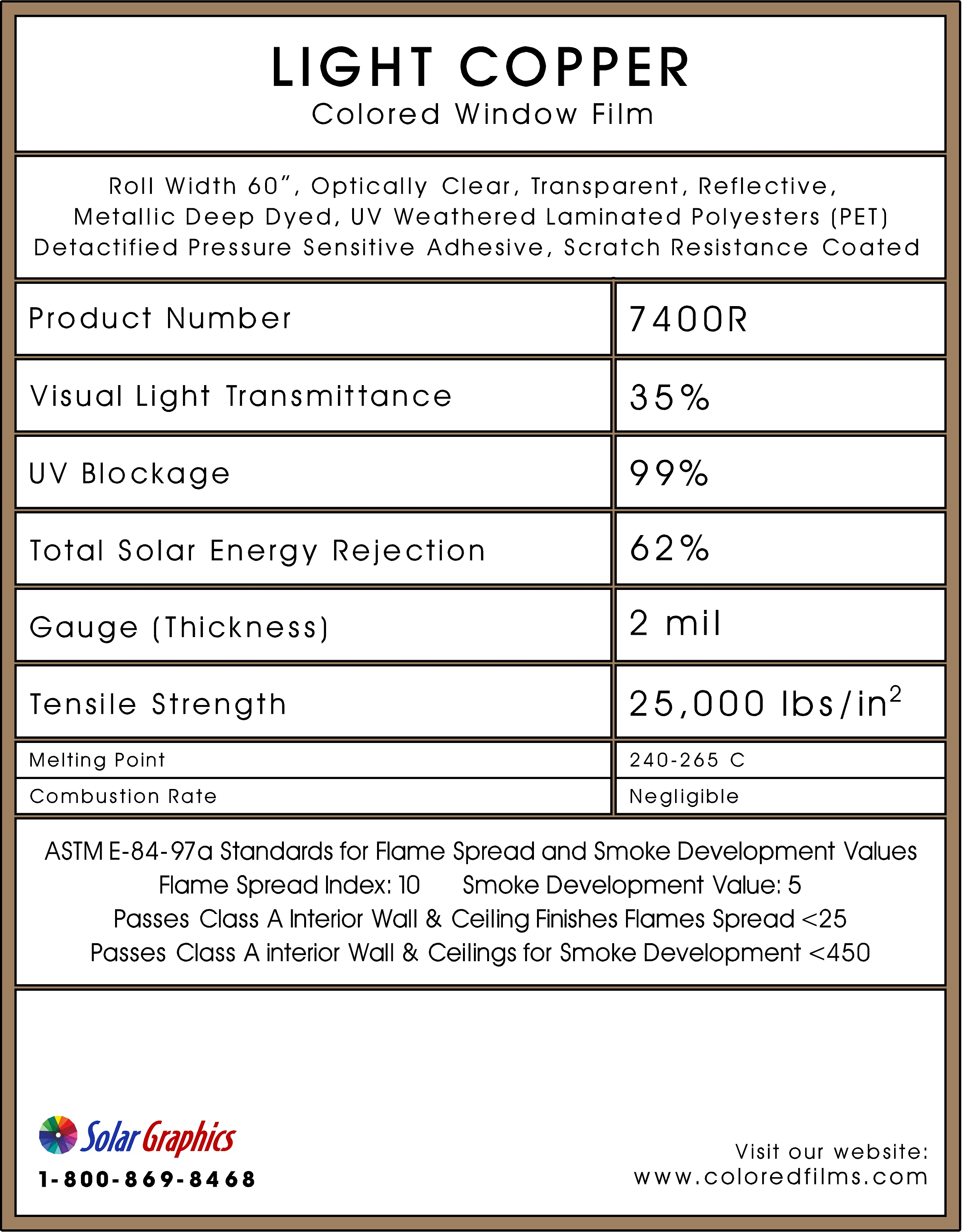 Light Copper .... Visual Light Transmittance 35% | Total Solar Energy Rejection 62% --------------------------------------------------------------------------- Transparent | Reflective | UV Weathered Deep Dyed Polyester | Pressure Sensitive | Scratch Coated