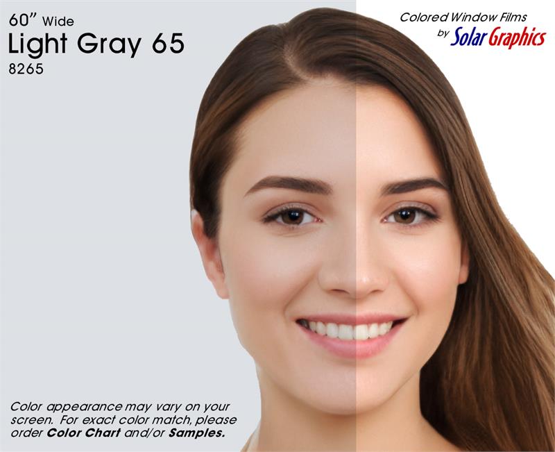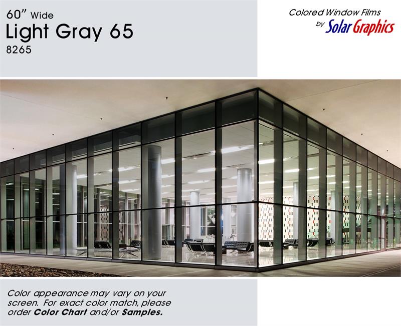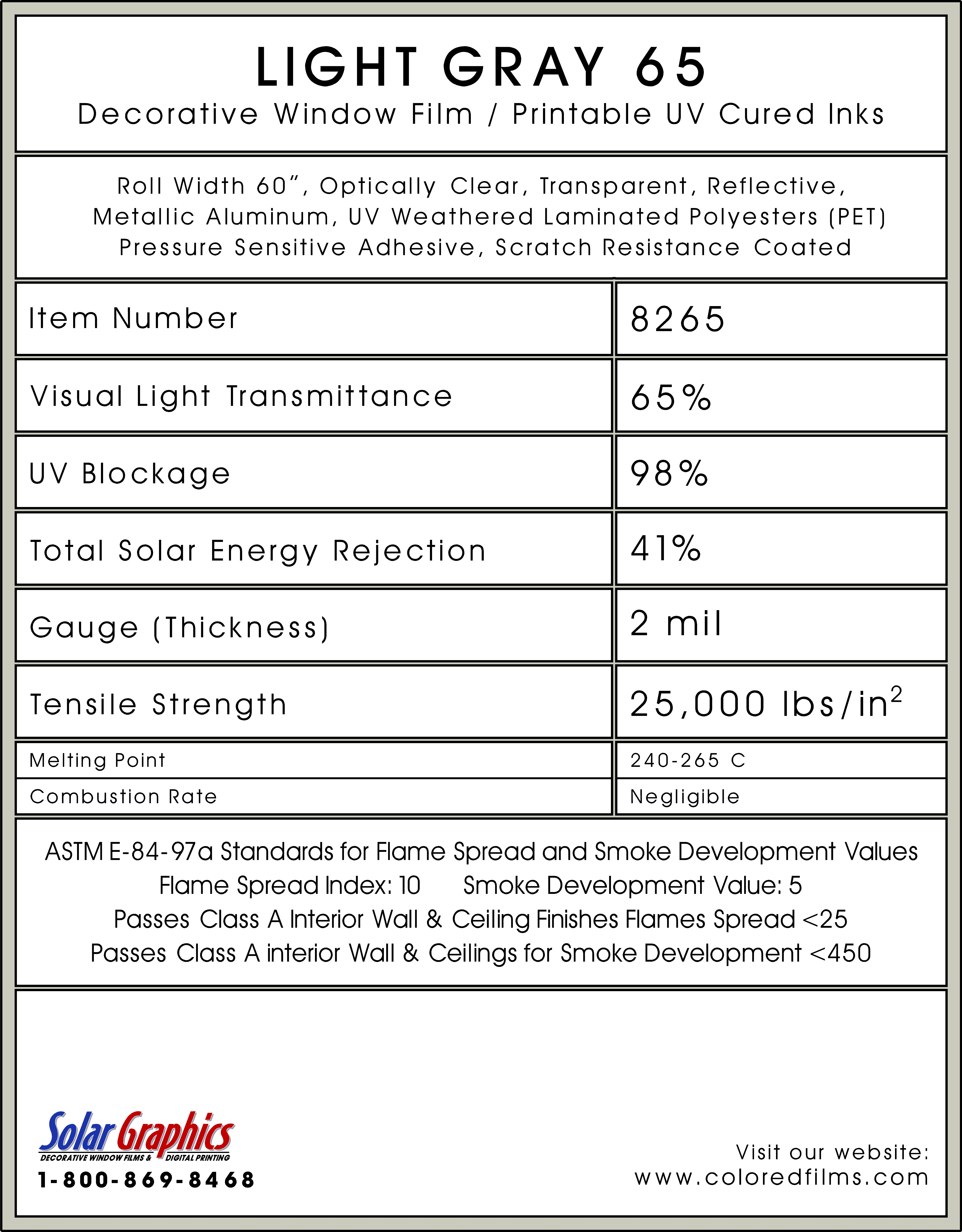 Light Gray 65 .... Visual Light Transmittance 65% | Total Solar Energy Rejection 41% --------------------------------------------------------------------------- Transparent | Non-Reflective | UV Weathered Deep Dyed Polyester | Pressure Sensitive | Scratch Coated