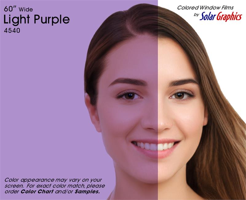 Light Purple .... Visual Light Transmittance 45% | Total Solar Energy Rejection 32% --------------------------------------------------------------------------- Transparent | Non-Reflective | UV Weathered Deep Dyed Polyester | Pressure Sensitive | Scratch Coated