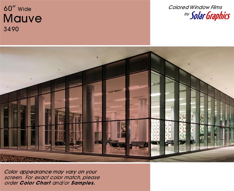 Mauve .... Visual Light Transmittance 50% | Total Solar Energy Rejection 33% --------------------------------------------------------------------------- Transparent | Non-Reflective | UV Weathered Deep Dyed Polyester | Pressure Sensitive | Scratch Coated