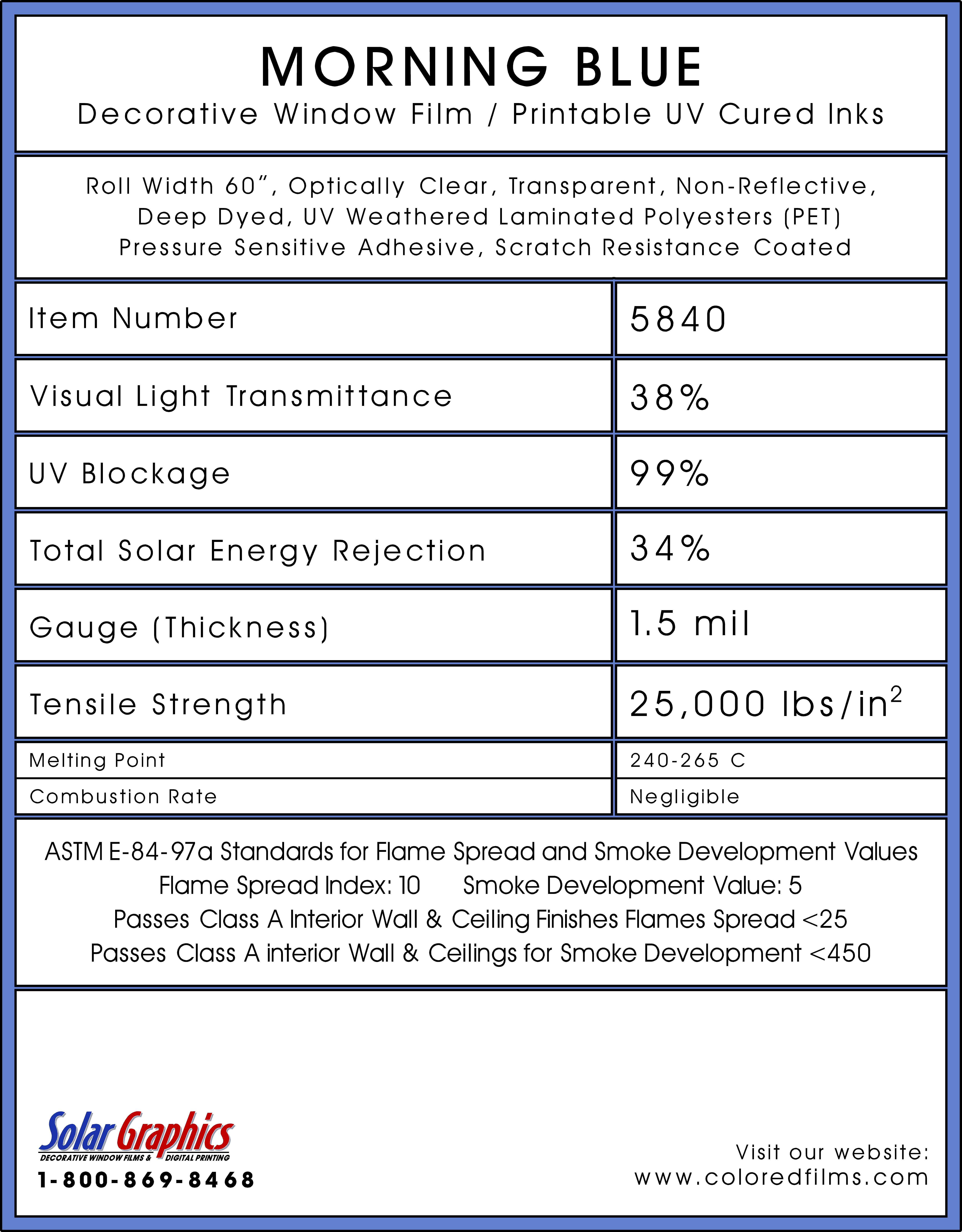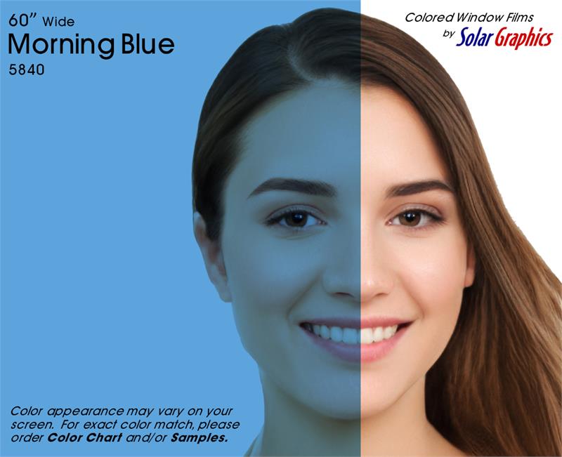 Morning Blue .... Visual Light Transmittance 38% | Total Solar Energy Rejection 34% --------------------------------------------------------------------------- Transparent | Non-Reflective | UV Weathered Deep Dyed Polyester | Pressure Sensitive | Scratch Coated