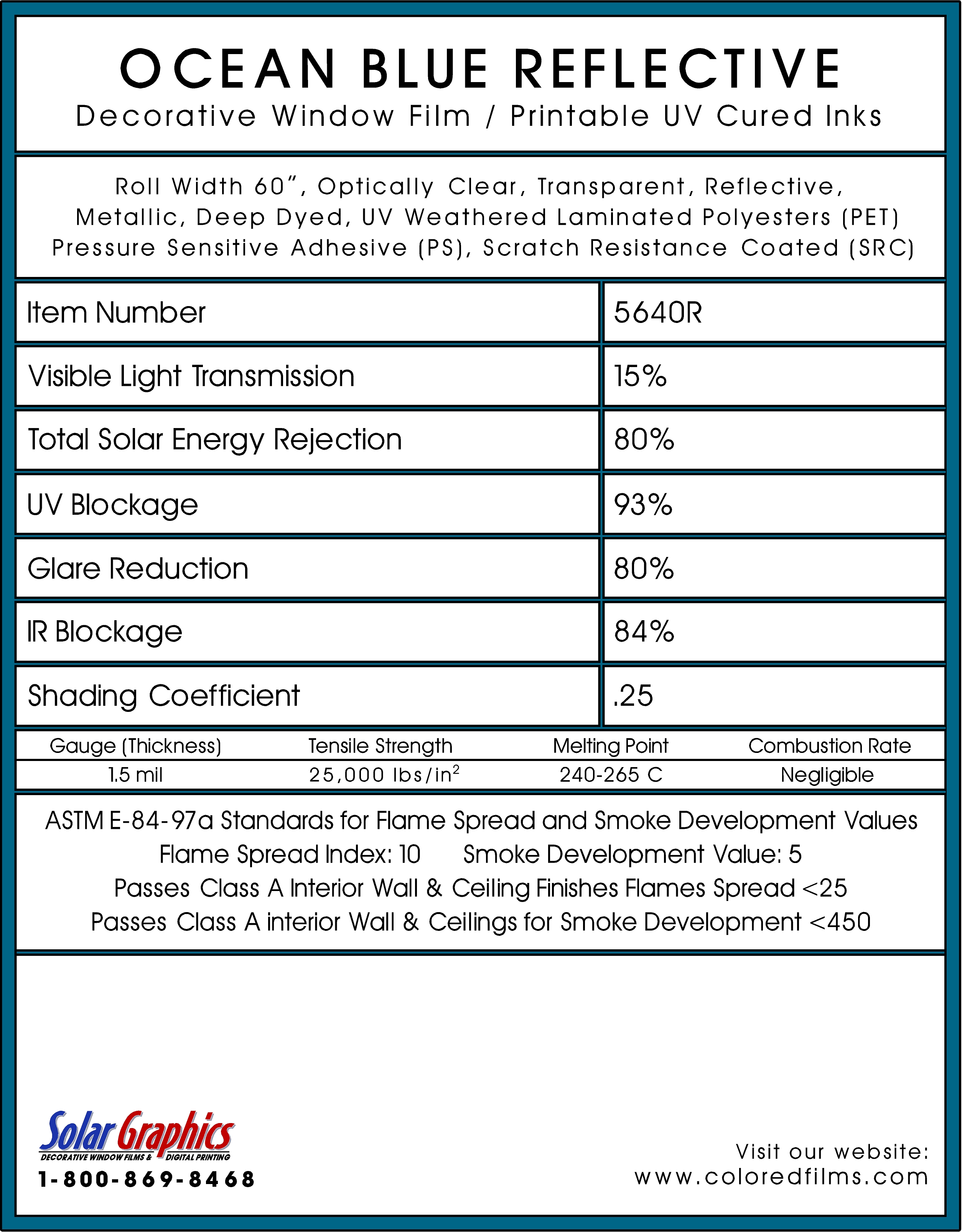 Ocean Blue Reflective .... Visual Light Transmittance 15% | Total Solar Energy Rejection 80% --------------------------------------------------------------------------- Transparent | Reflective | UV Weathered Deep Dyed Polyester | Pressure Sensitive | Scratch Coated