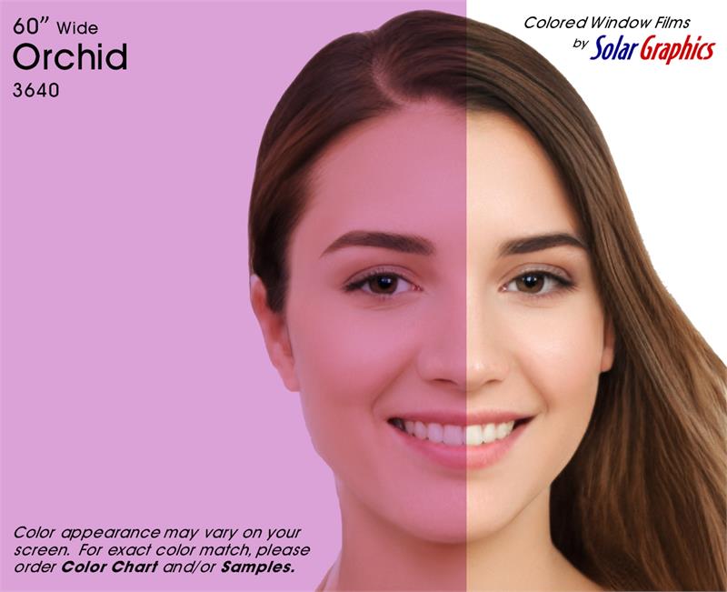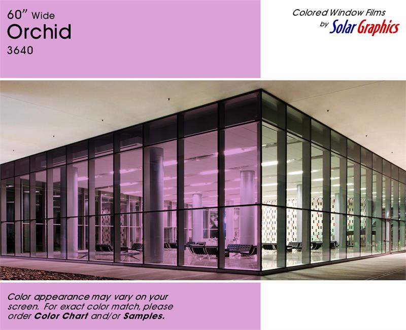 Orchid .... Visual Light Transmittance 60% | Total Solar Energy Rejection 24% --------------------------------------------------------------------------- Transparent | Non-Reflective | UV Weathered Deep Dyed Polyester | Pressure Sensitive | Scratch Coated