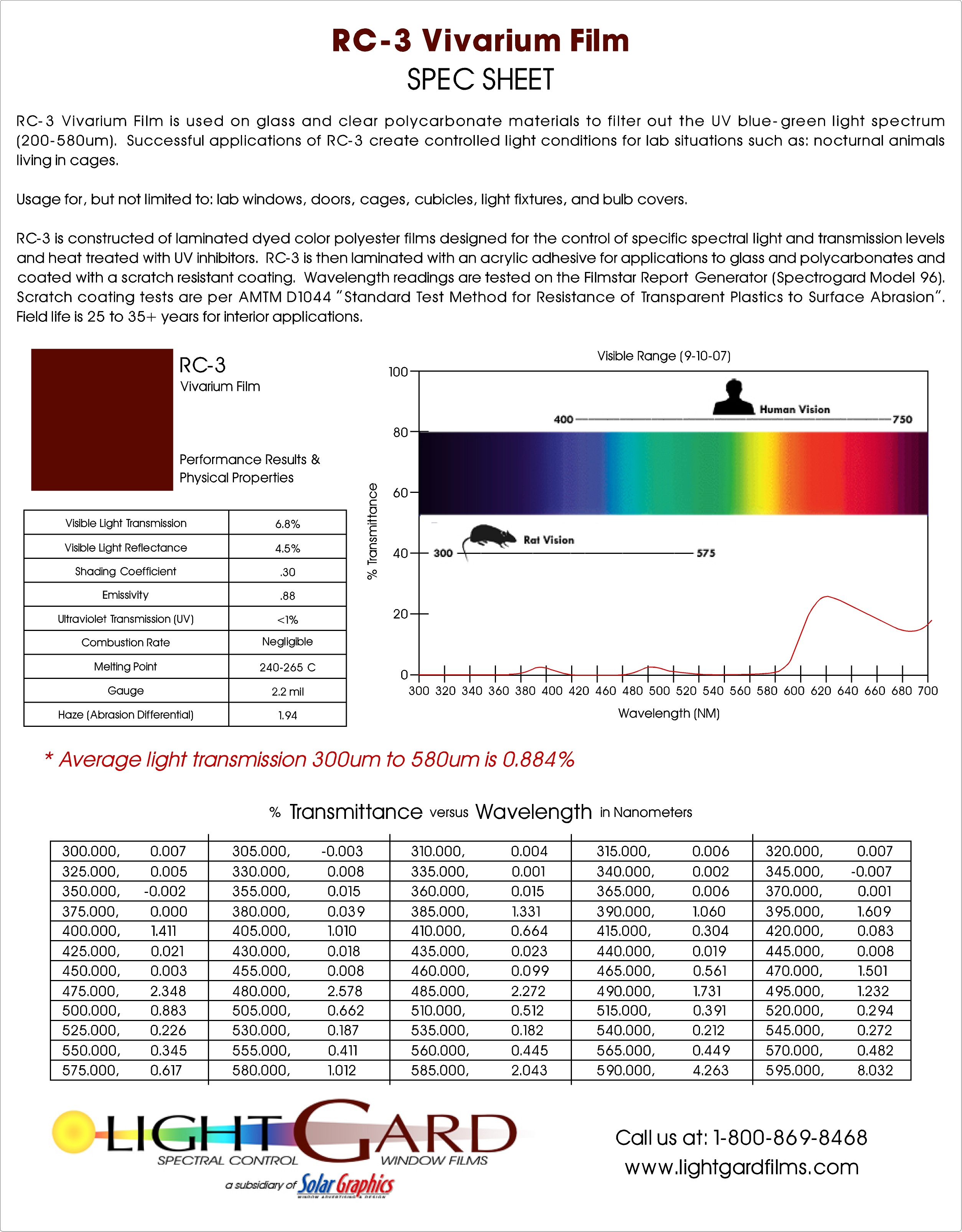 RC-3 Vivarium Film (formally called Rose Chocolate) is used on glass and clear polycarbonate materials to filter out the UV blue-green light spectrum (200-580um).  Successful applications of RC-3 create controlled light conditions for lab situations such as: nocturnal animals living in cages.  Usage for, but not limited to: lab windows, doors, cages, cubicles, light fixtures, and bulb covers.  RC-3 is constructed of laminated dyed color polyester films designed for the control of specific spectral light and transmission levels and heat treated with UV inhibitors.  RC-3 is then laminated with an acrylic adhesive for applications to glass and polycarbonates and coated with a scratch resistant coating.  Wavelength readings are tested on the Filmstar Report Generator (Spectrogard Model 96).  Scratch coating tests are per AMTM D1044 "Standard Test Method for Resistance of Transparent Plastics to Surface Abrasion".   Field life is 25 to 35+ years for interior applications.
