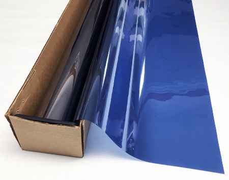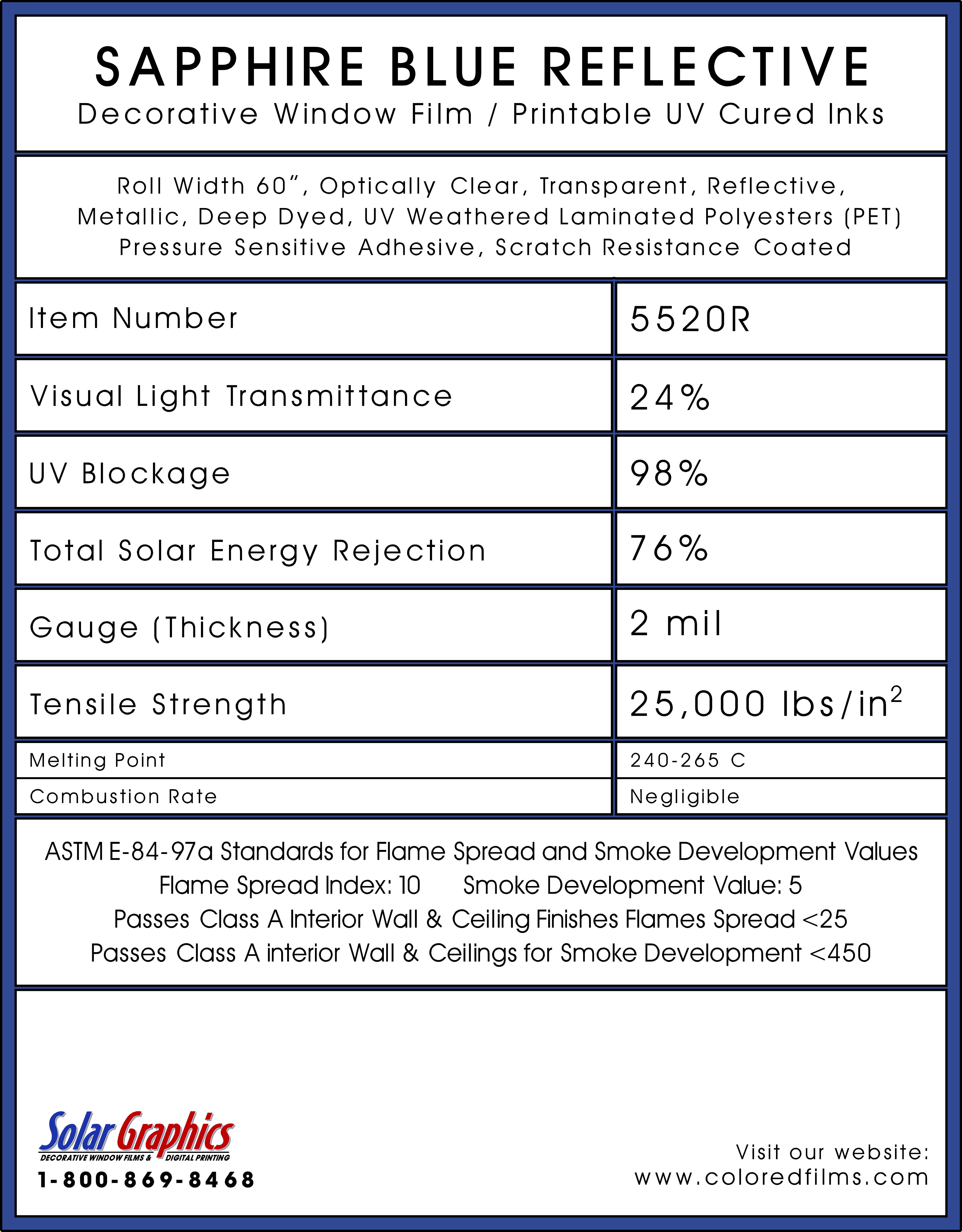 Sapphire Blue Reflective .... Visual Light Transmittance 24% | Total Solar Energy Rejection 76% --------------------------------------------------------------------------- Transparent | Reflective | UV Weathered Deep Dyed Polyester | Pressure Sensitive | Scratch Coated