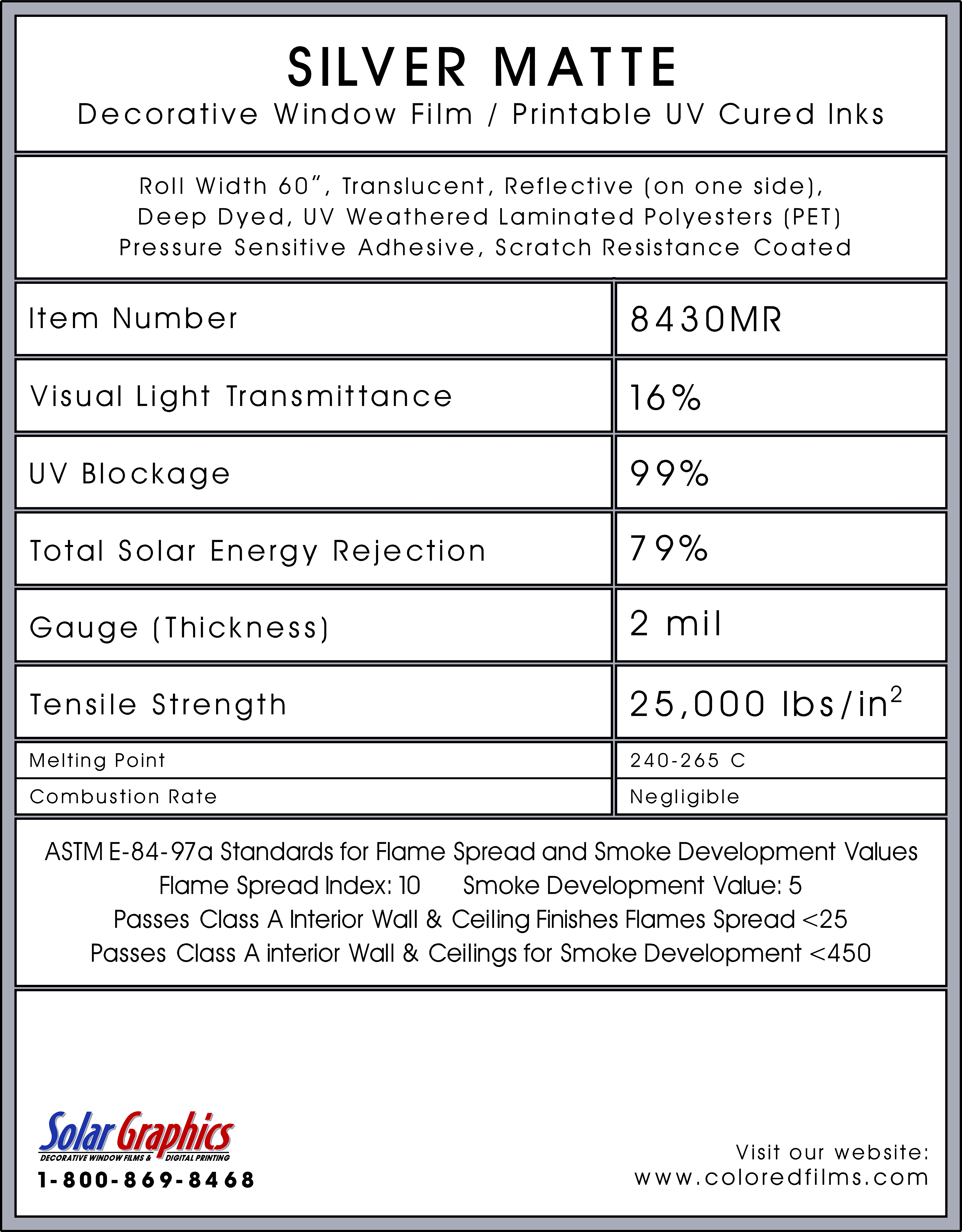 Silver Matte .... Etch (Film Side) | Silver Reflective (Adhesive Side) Visual Light Transmittance 16% | Total Solar Energy Rejection 79% --------------------------------------------------------------------------- Translucent | UV Weathered Deep Dyed Polyester | Pressure Sensitive | Scratch Coated