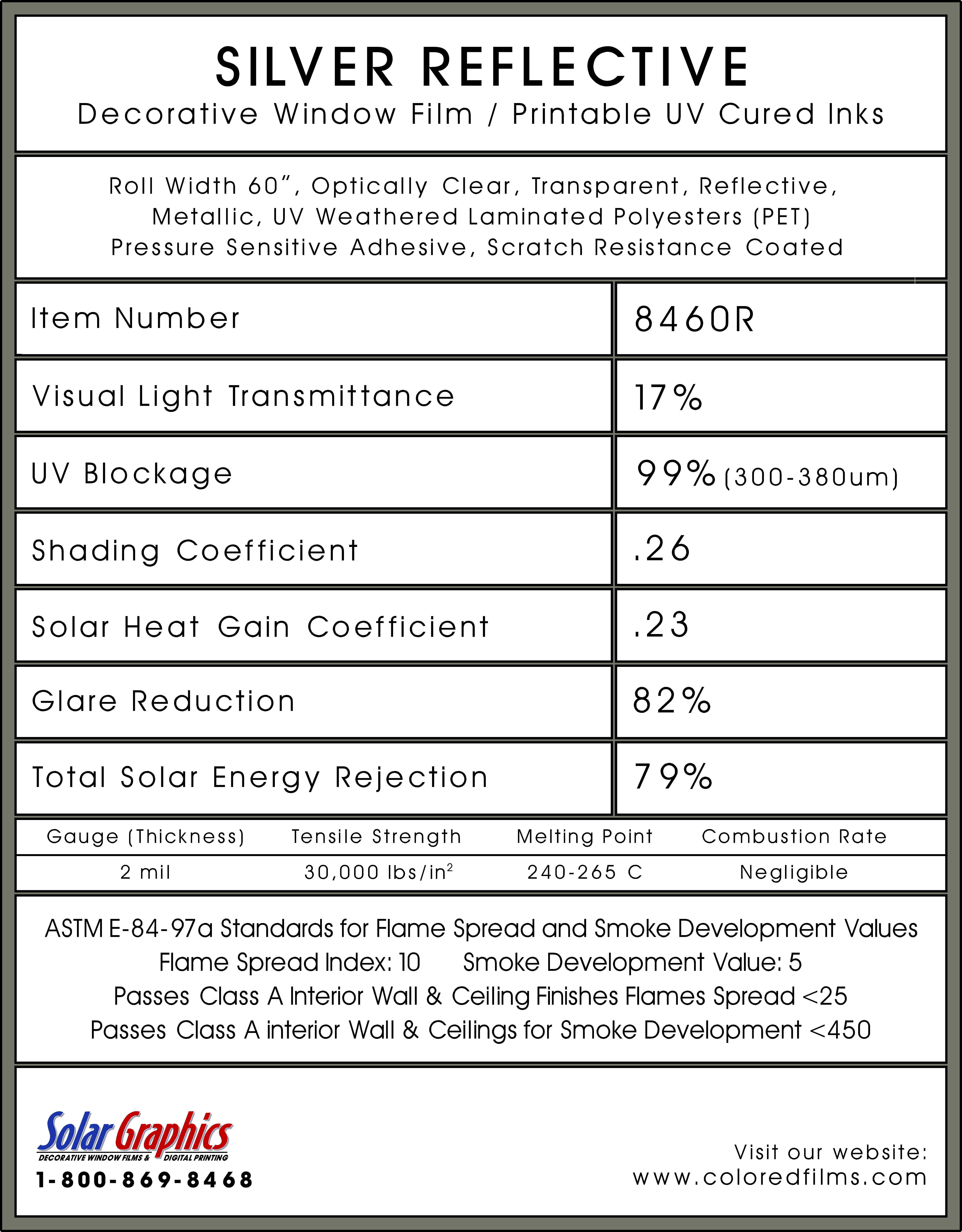 Silver Reflective .... Visual Light Transmittance 17% | Total Solar Energy Rejection 79% --------------------------------------------------------------------------- Transparent | Reflective | UV Weathered Deep Dyed Polyester | Pressure Sensitive | Scratch Coated