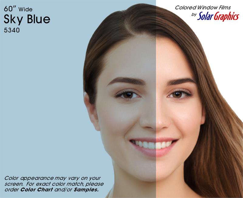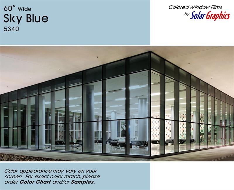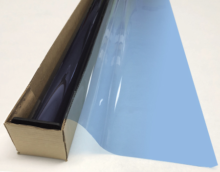Sky Blue .... Visual Light Transmittance 60% | Total Solar Energy Rejection 27% --------------------------------------------------------------------------- Transparent | Non-Reflective | UV Weathered Deep Dyed Polyester | Pressure Sensitive | Scratch Coated