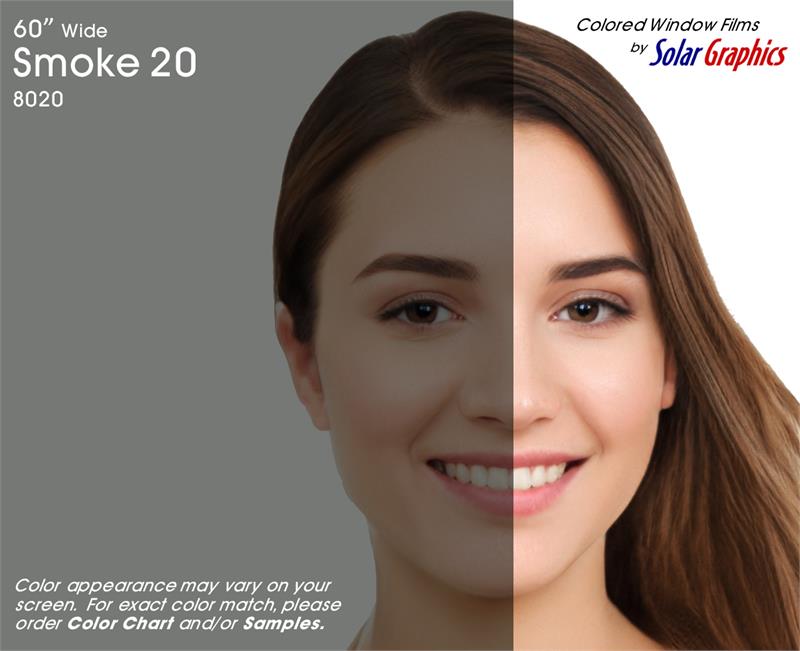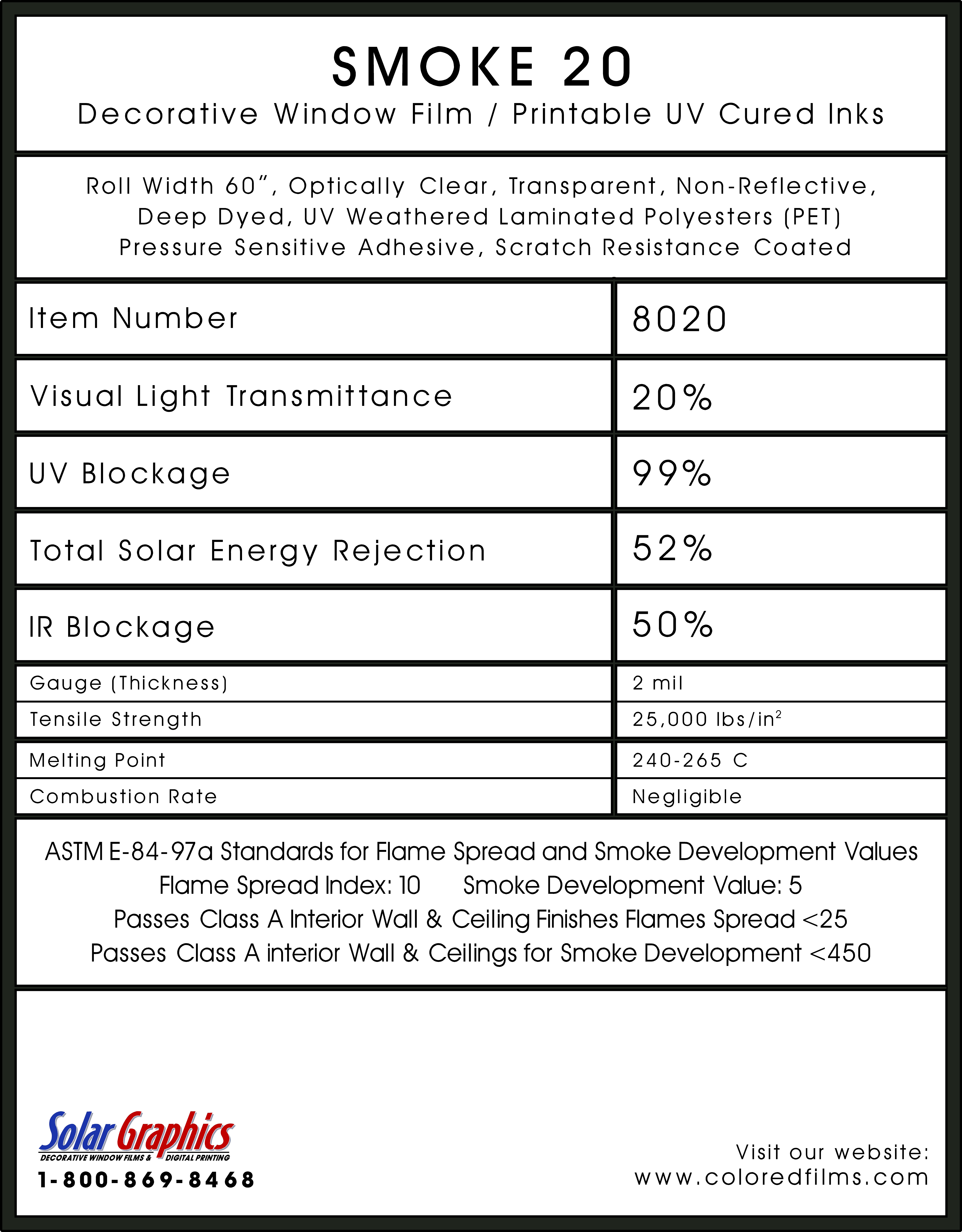 Smoke 20 .... Visual Light Transmittance 20% | Total Solar Energy Rejection 52% --------------------------------------------------------------------------- Transparent | Non-Reflective | UV Weathered Deep Dyed Polyester | Pressure Sensitive | Scratch Coated