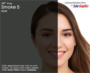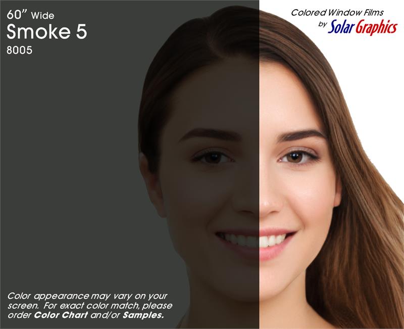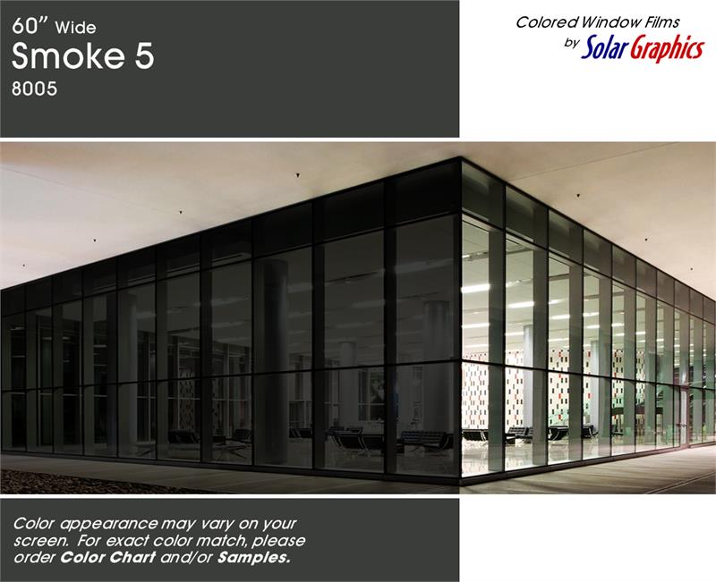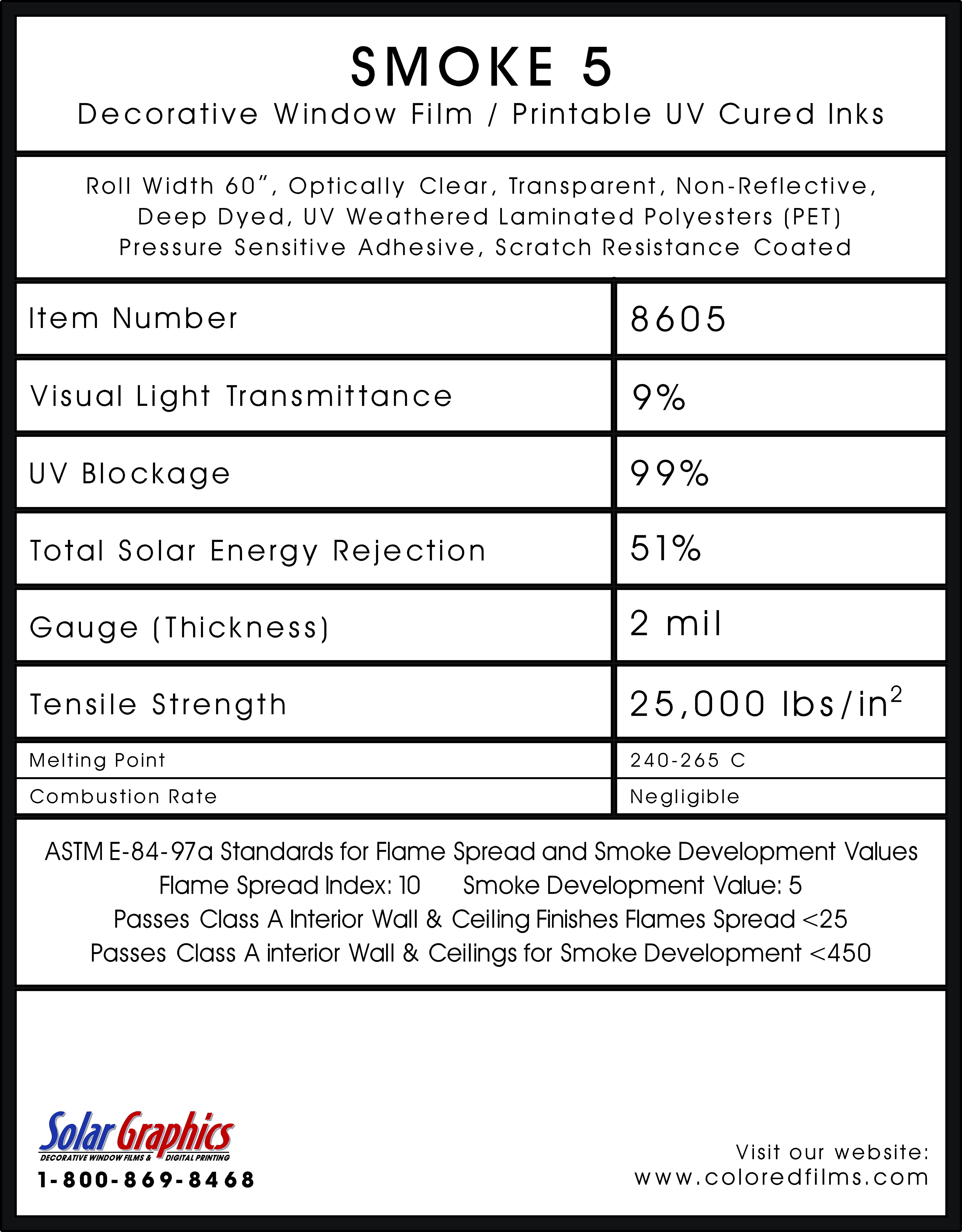 Smoke 5 .... Visual Light Transmittance 9% | Total Solar Energy Rejection 51% --------------------------------------------------------------------------- Transparent | Non-Reflective | UV Weathered Deep Dyed Polyester | Pressure Sensitive | Scratch Coated