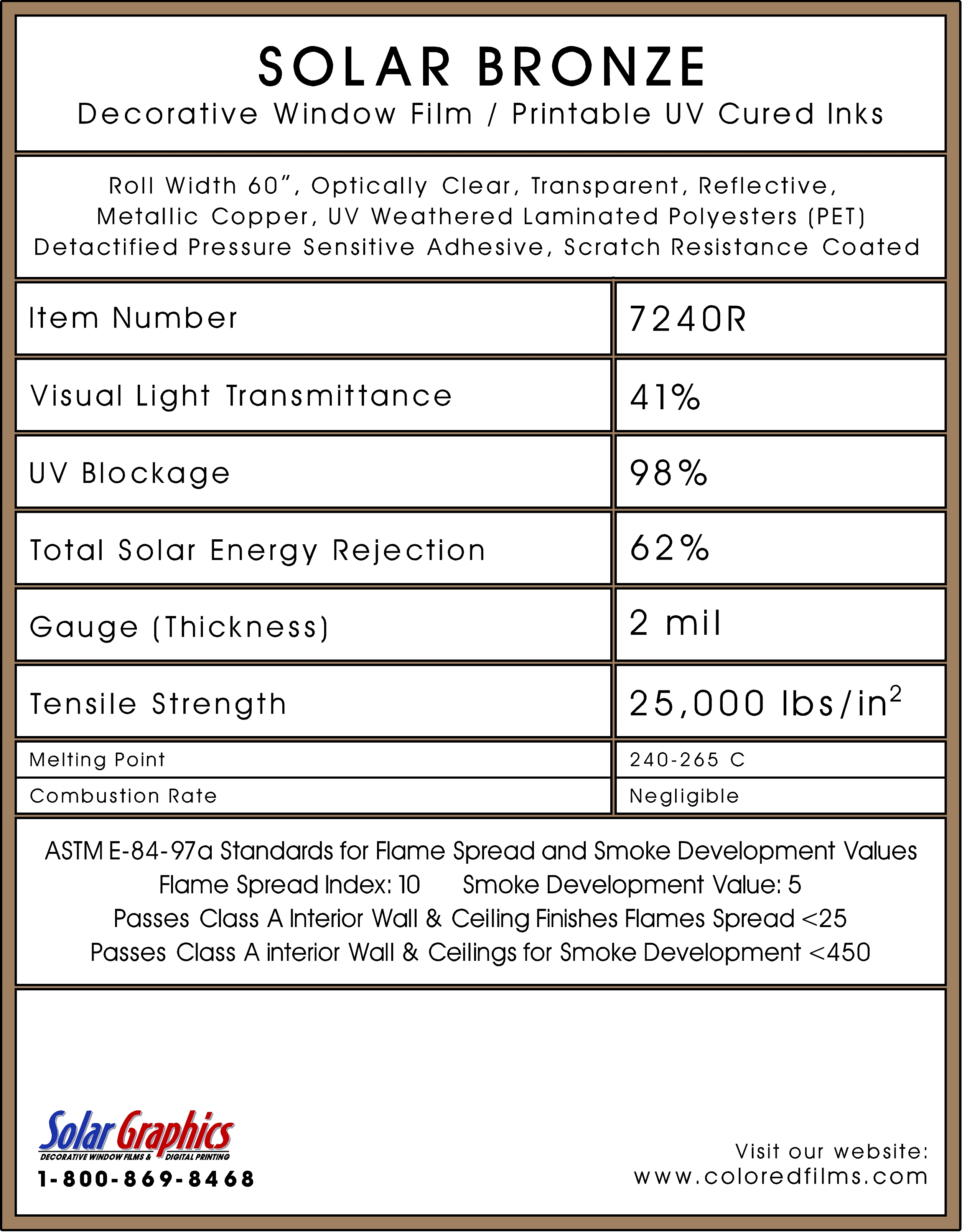 Solar Bronze 35 .... Visual Light Transmittance 35% | Total Solar Energy Rejection 70% --------------------------------------------------------------------------- Transparent | Reflective | UV Weathered Deep Dyed Polyester | Pressure Sensitive | Scratch Coated