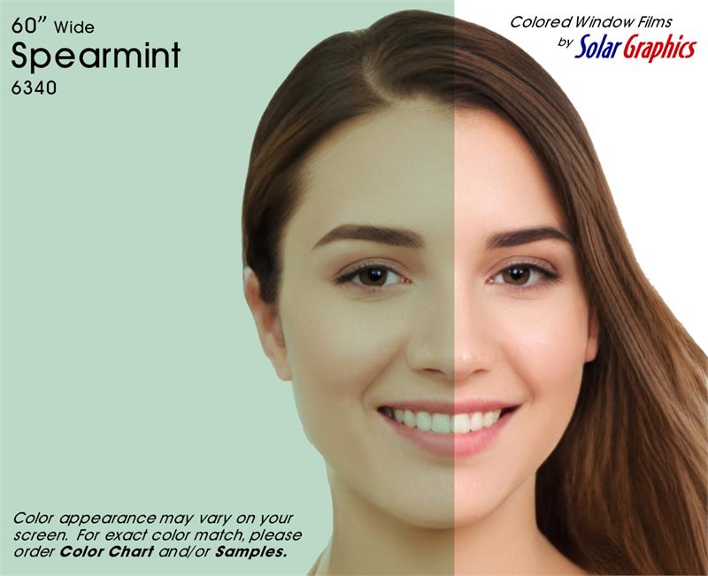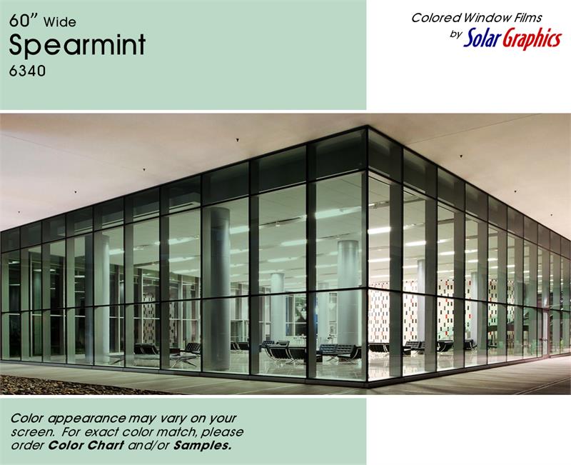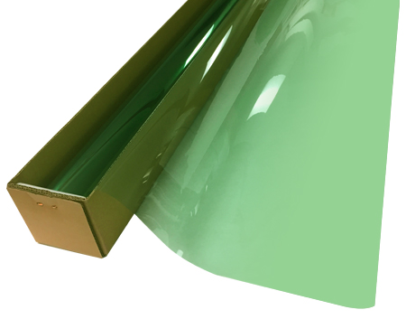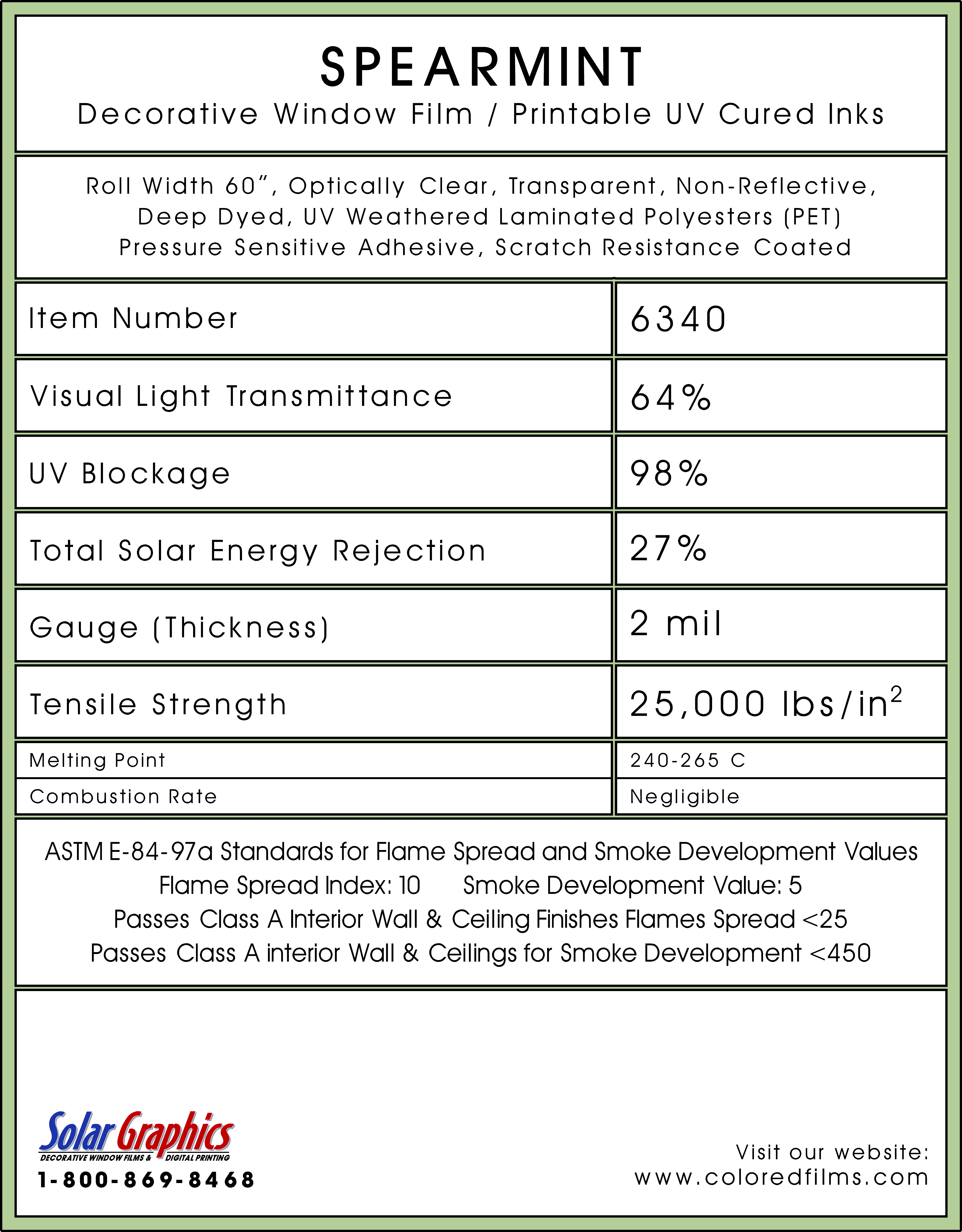 Spearmint .... Visual Light Transmittance 64% | Total Solar Energy Rejection 27% --------------------------------------------------------------------------- Transparent | Non-Reflective | UV Weathered Deep Dyed Polyester | Pressure Sensitive | Scratch Coated