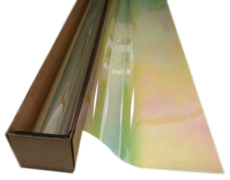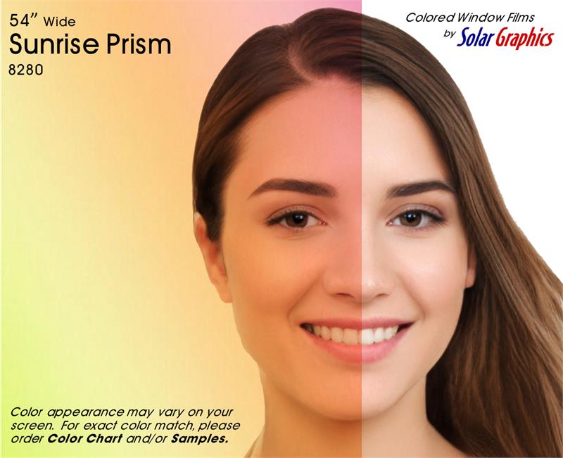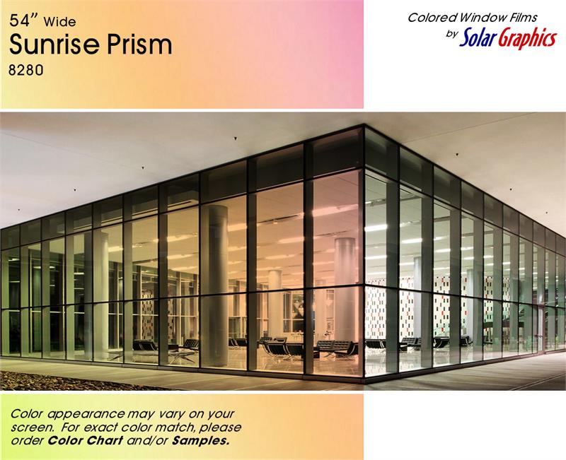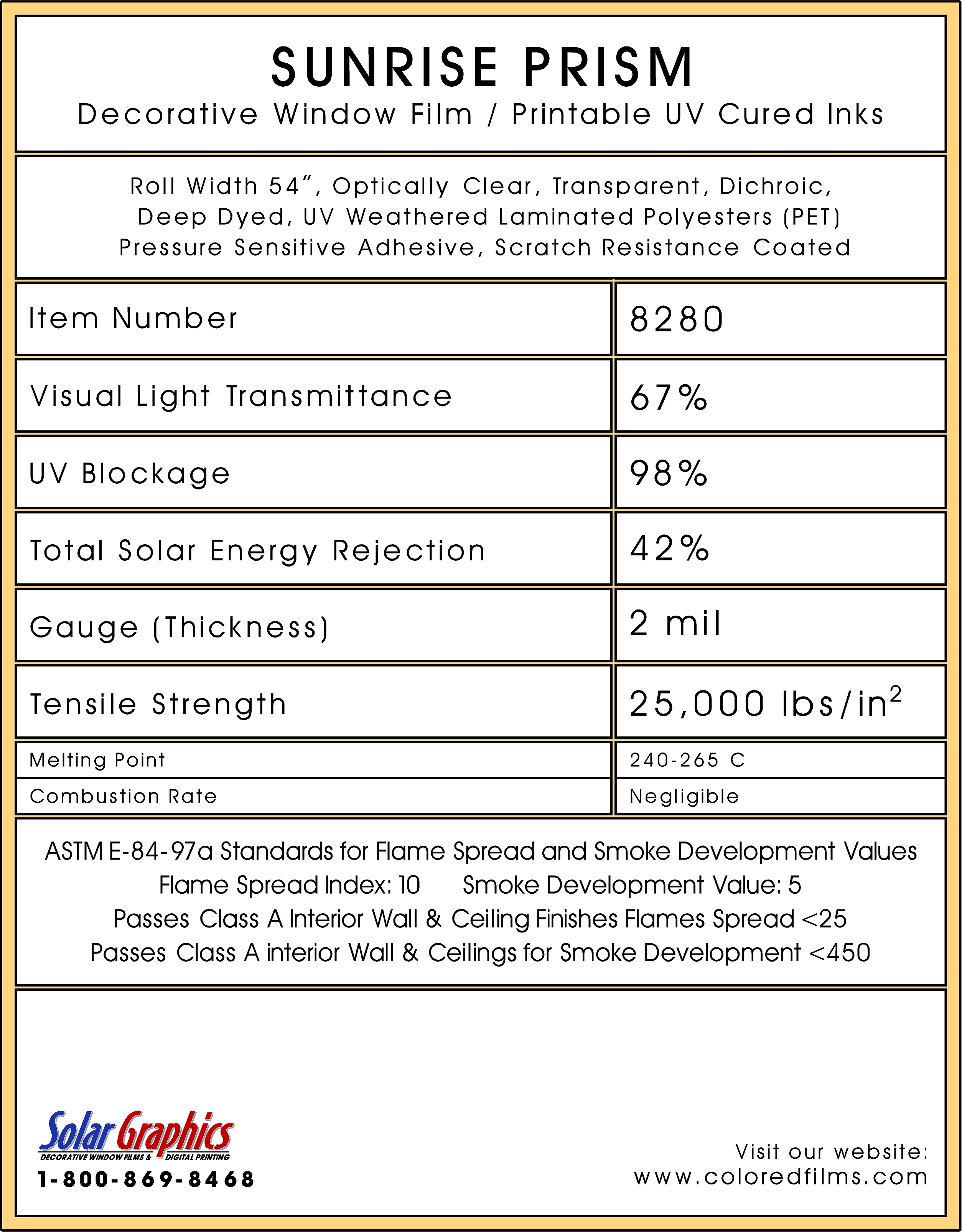 Sunrise Prism .... Visual Light Transmittance 67% | Total Solar Energy Rejection 42% --------------------------------------------------------------------------- Transparent | Dichroic | UV Weathered Deep Dyed Polyester | Pressure Sensitive | Scratch Coated