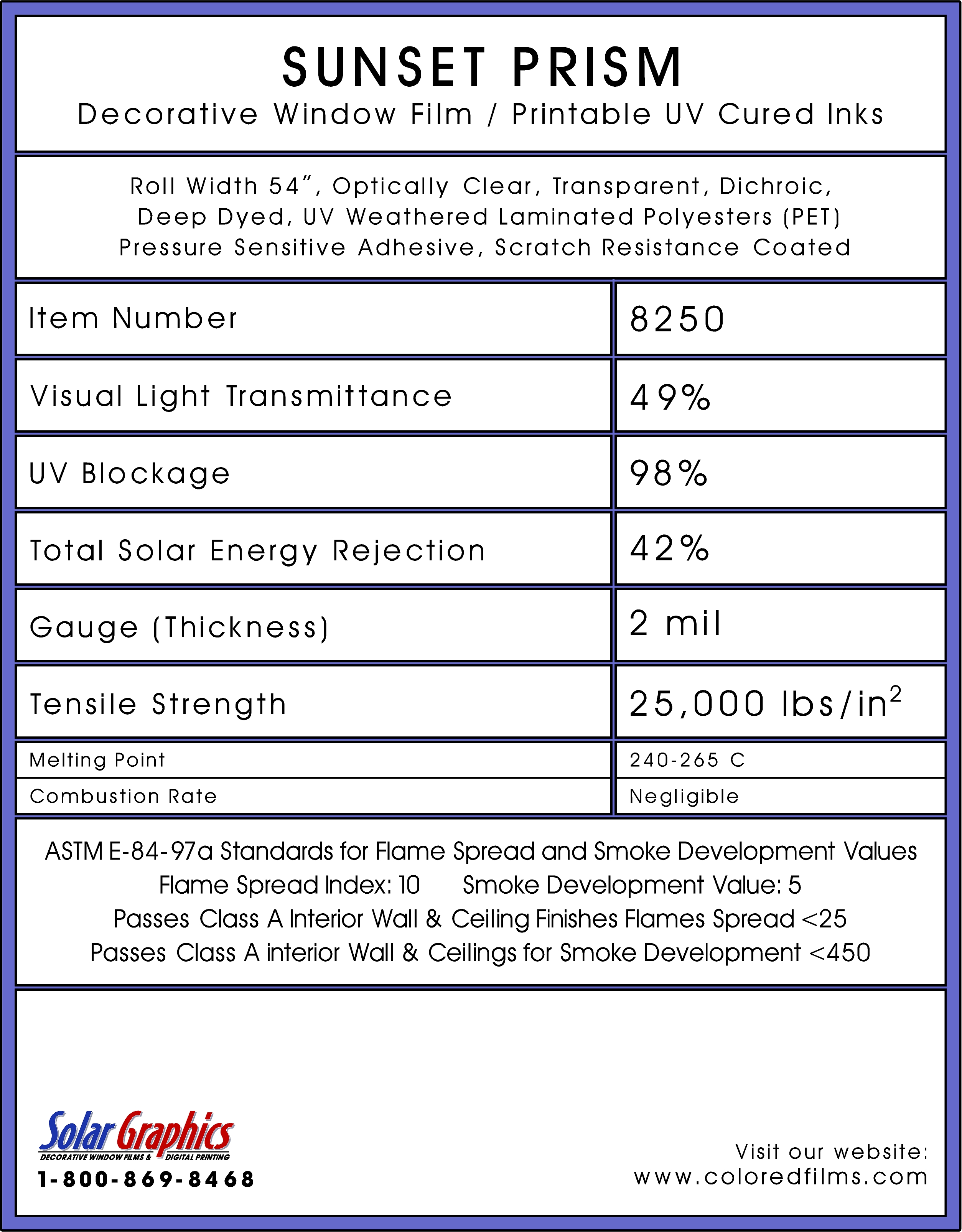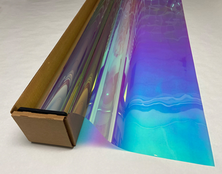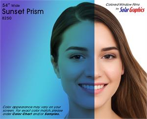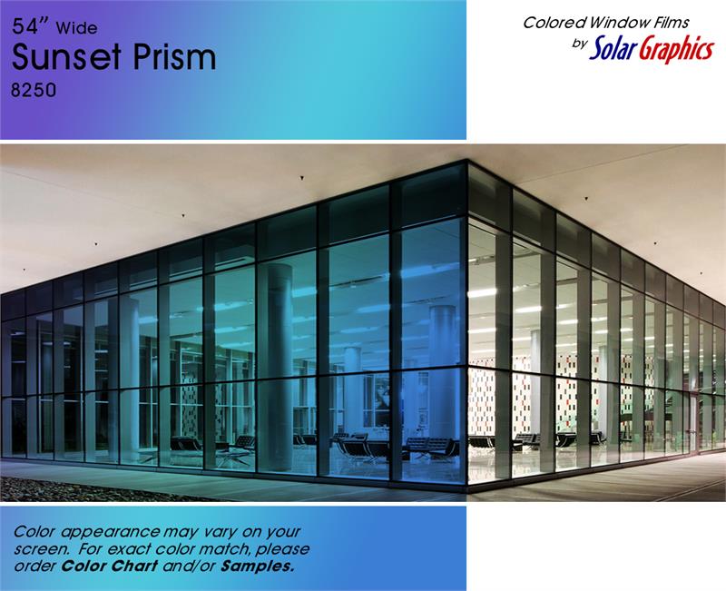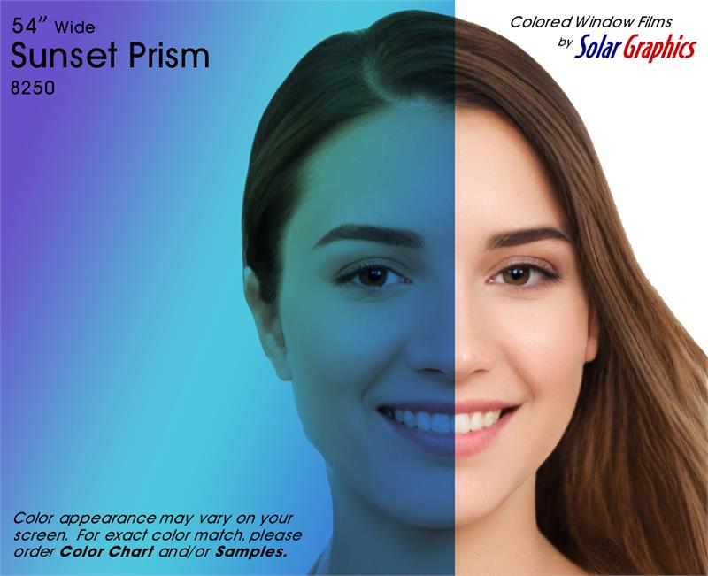 Sunset Prism .... Visual Light Transmittance 49% | Total Solar Energy Rejection 42% --------------------------------------------------------------------------- Transparent | Dichroic | UV Weathered Deep Dyed Polyester | Pressure Sensitive | Scratch Coated