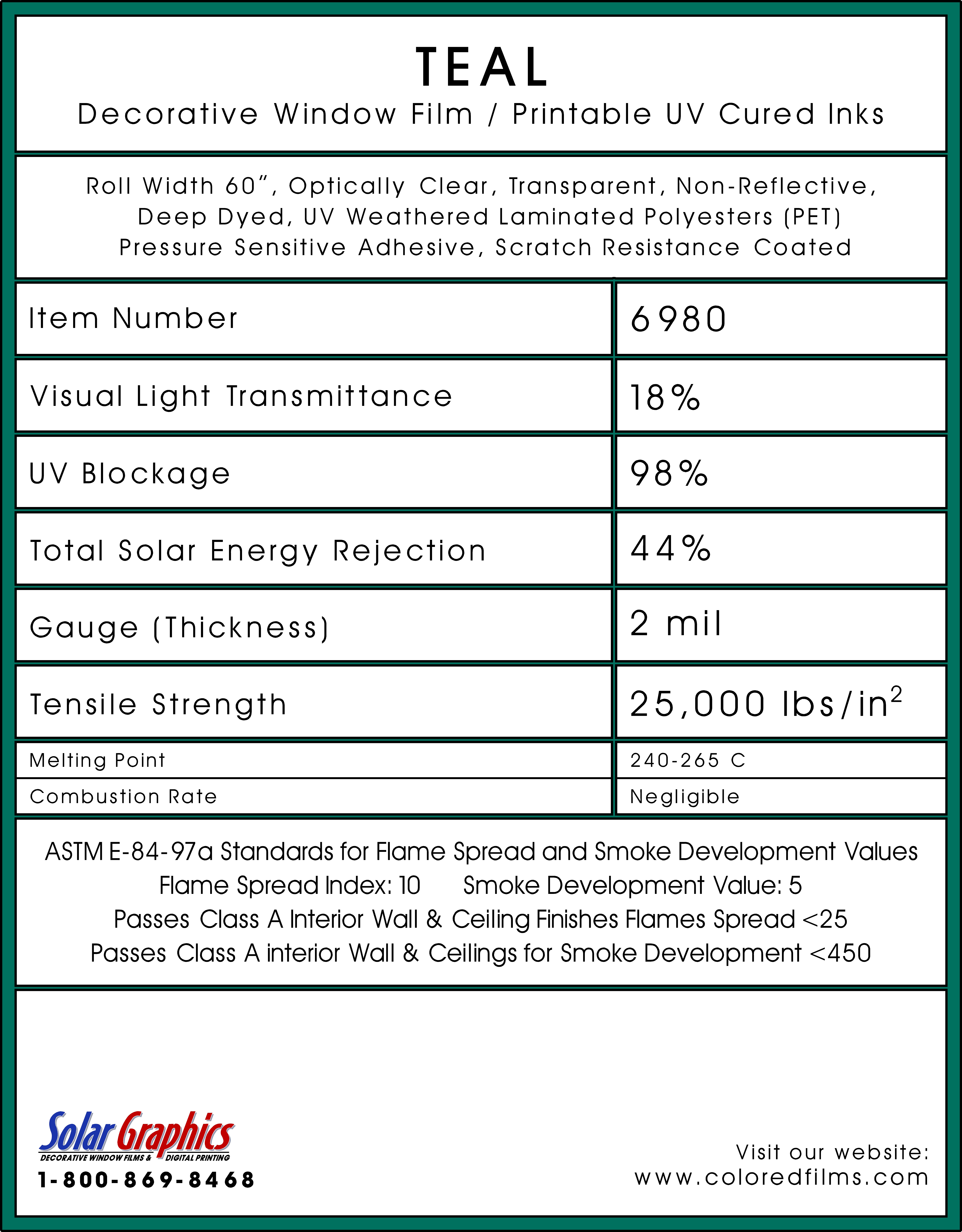 Description: . High performance polyester (PET) film deep-dyed colored, laminated with optically clear adhesives. Materials are UV treated for long term sun exposure.