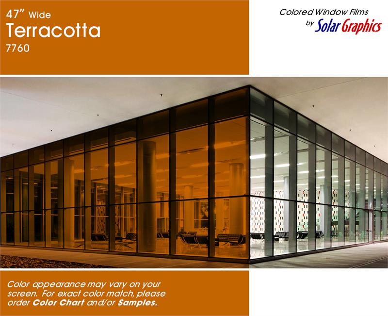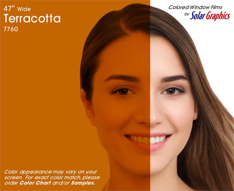 Terracotta .... Visual Light Transmittance 36% | Total Solar Energy Rejection 41% --------------------------------------------------------------------------- Transparent | Non-Reflective | UV Weathered Deep Dyed Polyester | Pressure Sensitive | Scratch Coated