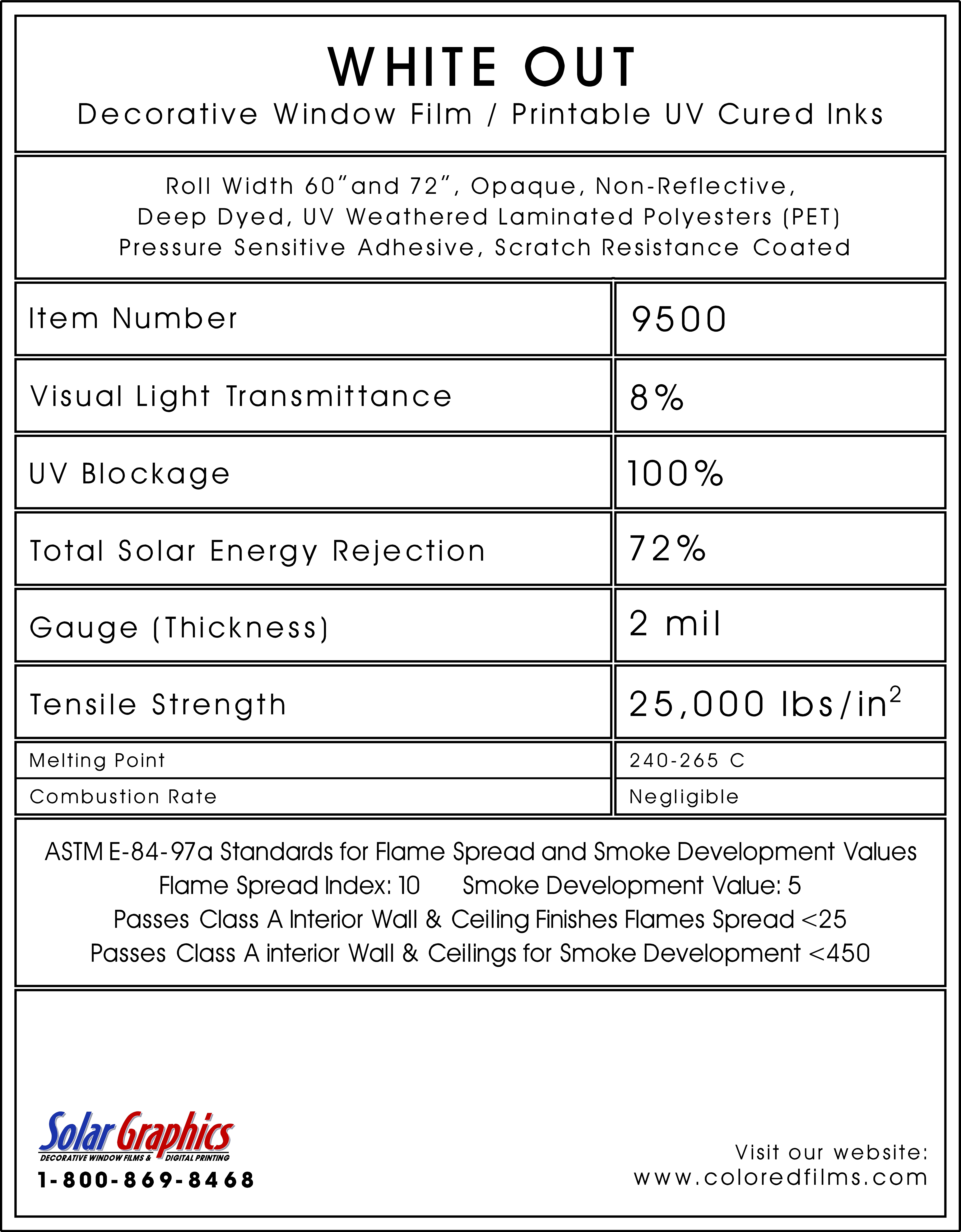 White Out .... Visual Light Transmittance 8% | Total Solar Energy Rejection 72% --------------------------------------------------------------------------- Opaque | Non-Reflective | UV Weathered Deep Dyed Polyester | Pressure Sensitive | Scratch Coated
