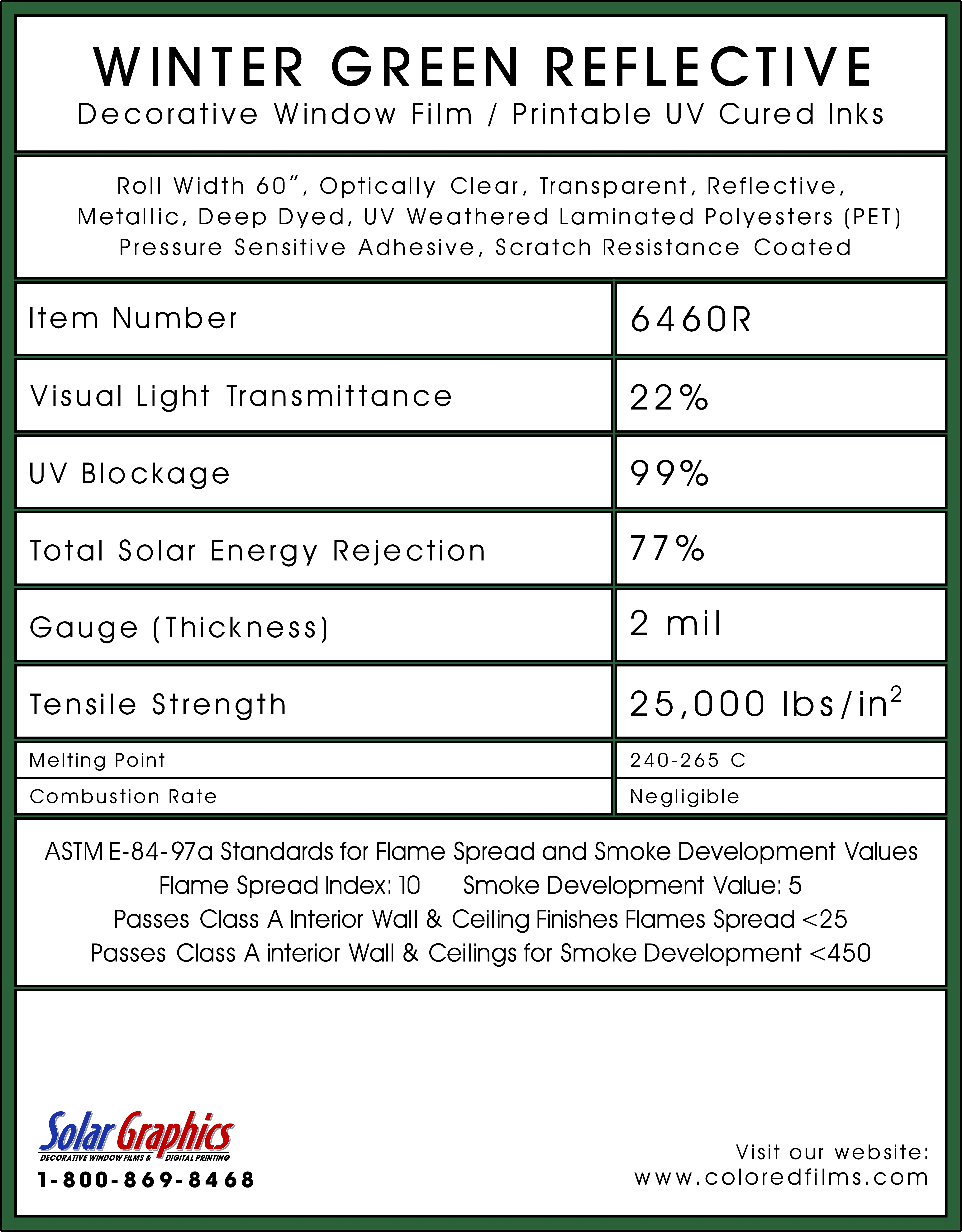 Winter Green Reflective .... Visual Light Transmittance 22% | Total Solar Energy Rejection 77% --------------------------------------------------------------------------- Transparent | Reflective | UV Weathered Deep Dyed Polyester | Pressure Sensitive | Scratch Coated